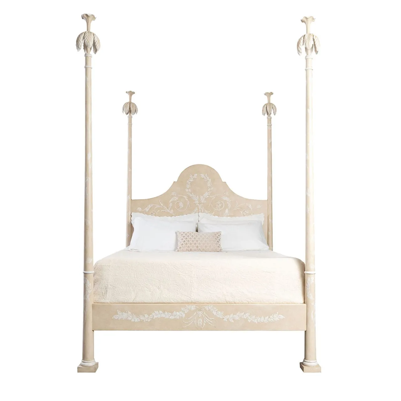 Il letto Roma in color tortora chiaro incarna serenità ed eleganza senza tempo. Notevole per i suoi montanti a tutta altezza e la testiera graziosamente curvata, questo letto queen size funge da splendido centrotavola. L’intricata decorazione in gesso a rilievo contrasta splendidamente con la base sottilmente più scura, creando un look sofisticato e raffinato. Il suo design versatile consente una perfetta integrazione con vari tessuti e colori delle pareti, rendendolo adatto a diversi stili di interni. Ogni letto Roma è meticolosamente decorato con tecniche artigianali del XVIII secolo. Questo letto squisito invita al calore e al fascino, rendendolo un delizioso rifugio in cui tornare a casa. Sono disponibili opzioni di personalizzazione che consentono di scegliere colori e decorazioni personalizzate. Per ulteriori informazioni, contattare il Concierge. La base del letto e il montante non sono inclusi.