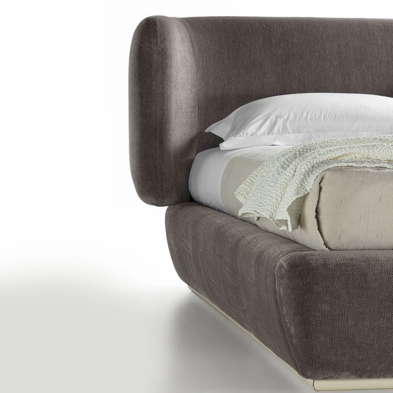 Letto imbottito caratterizzato dalla morbidezza dei volumi. La rete e il materasso non sono inclusi. Rivestimento disponibile in diversi tessuti su richiesta.
