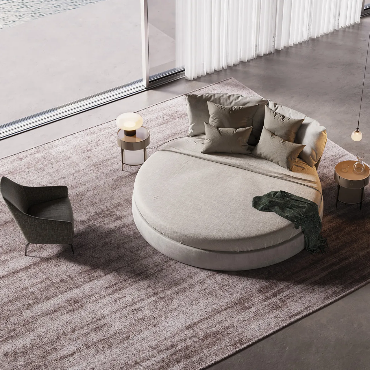 Realizzato con una struttura in acciaio verniciato rivestita in poliuretano espanso resiliente, questo letto rotondo emana un fascino contemporaneo. I cuscini del poggiatesta, imbottiti di piume, offrono un comfort soffice, mentre la base in legno forato assicura un sostegno ottimale al materasso. Rivestito in tessuto grigio, poggia su piedini antiscivolo. Materasso, cuscini e biancheria non sono inclusi nel prezzo. Questo pezzo dello Studio Angeletti Ruzza può essere dotato di proprietà ignifughe su richiesta.