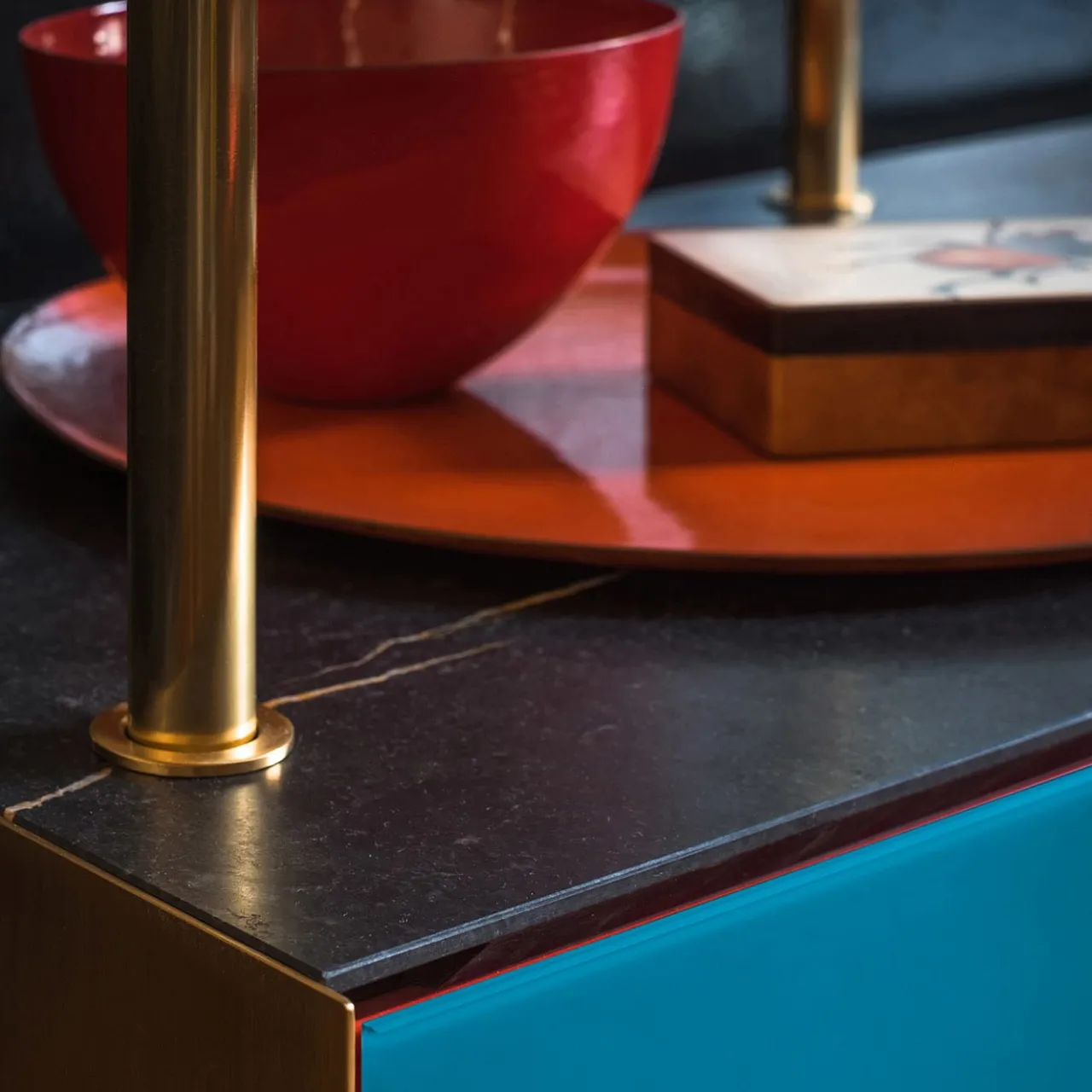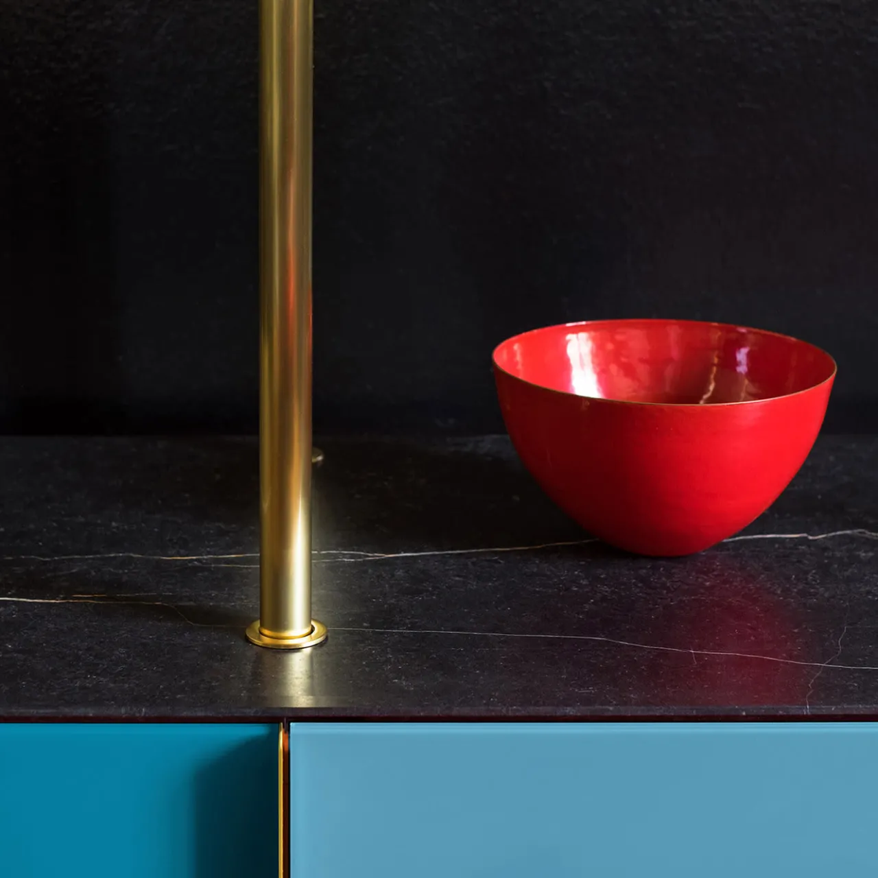 Luminosa e funzionale, questa libreria da terra è composta da una scaffalatura a giorno in ottone lucido appoggiata su un vano in legno laccato a 3 ante con piano in marmo New Saint Laurent, ripiani interni in vetro e ante in vetro retroverniciato nei toni del blu rilassante e maniglie verticali in ottone. Si tratta di un progetto su misura, la cui altezza dipende dalle misure specifiche del soffitto del cliente. Chiedete al Concierge i dettagli e le varianti di materiale e colore disponibili.