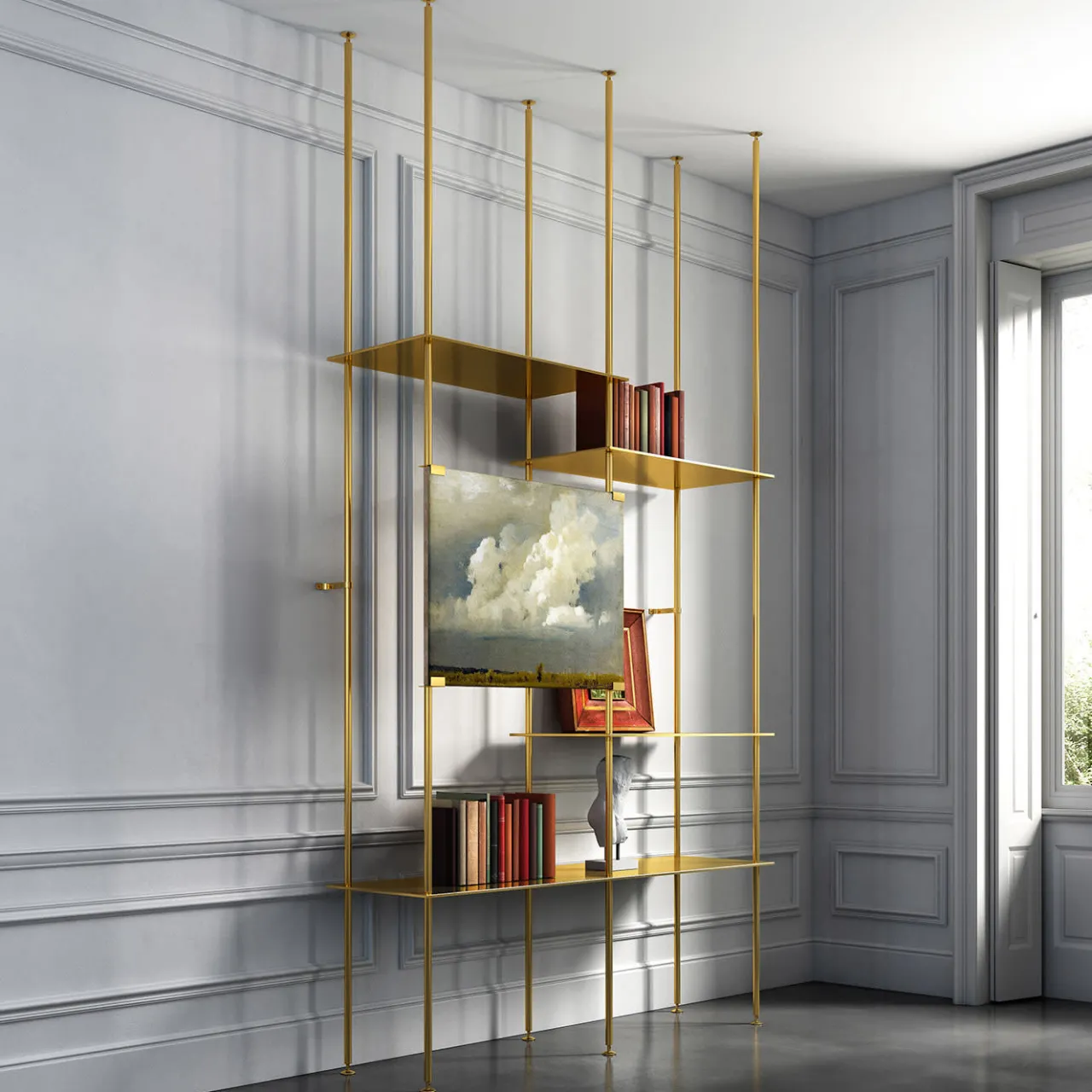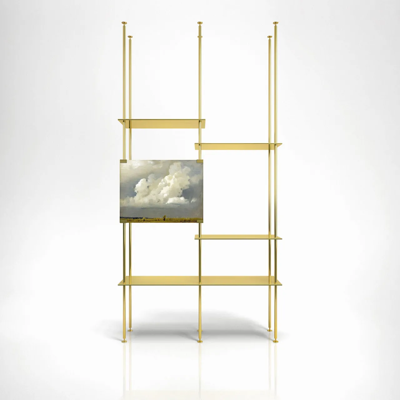 Leggerezza e luminosità definiscono al meglio il carattere di questa libreria da terra a soffitto in ottone lucido, il cui design asimmetrico non presenta giunzioni visibili. L’altezza finale del progetto sarà determinata dall’altezza della stanza in cui verrà collocata, poiché il pezzo è realizzato su ordinazione. È incluso un elemento separato che consente un facile montaggio a parete della libreria.