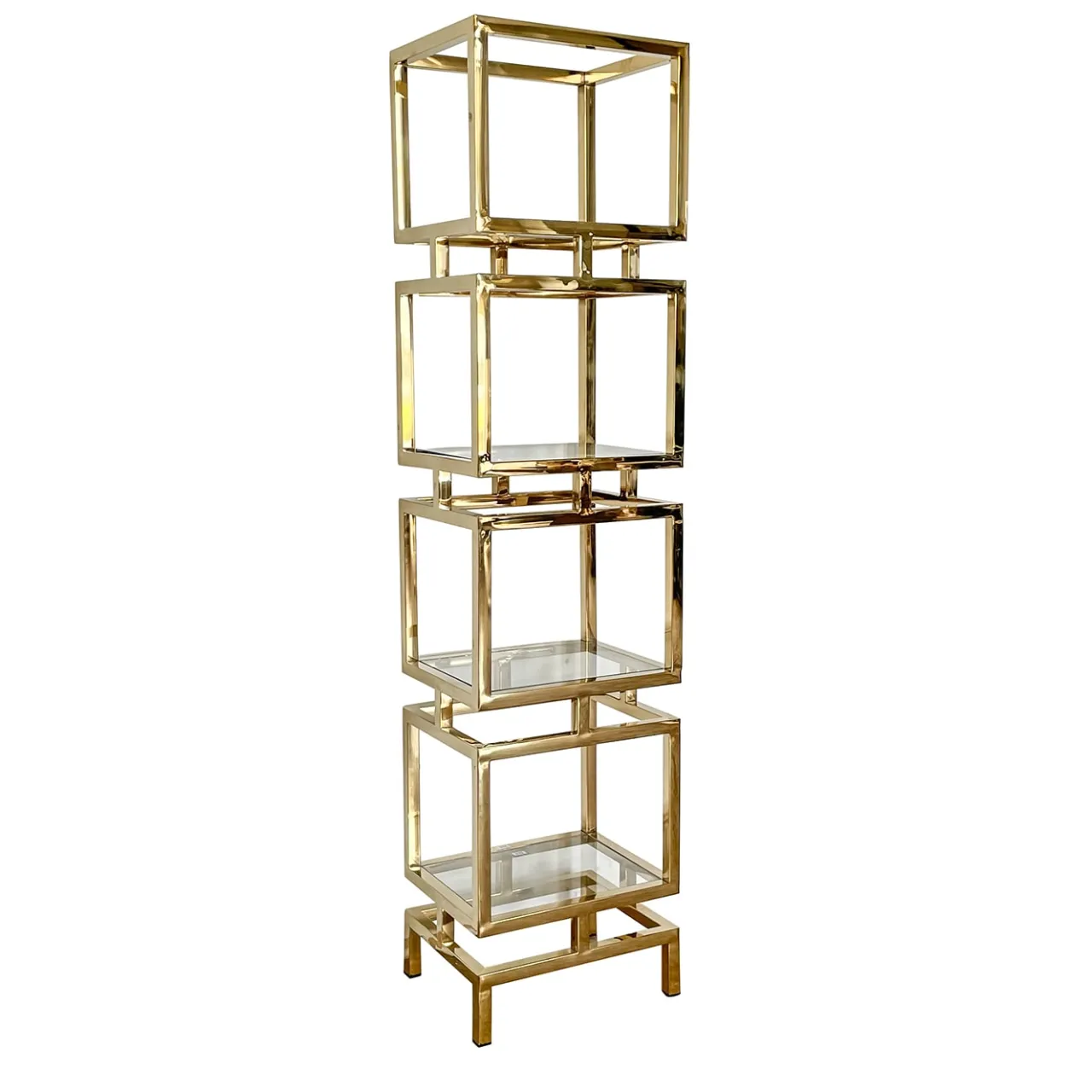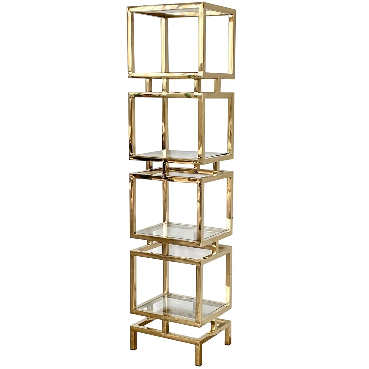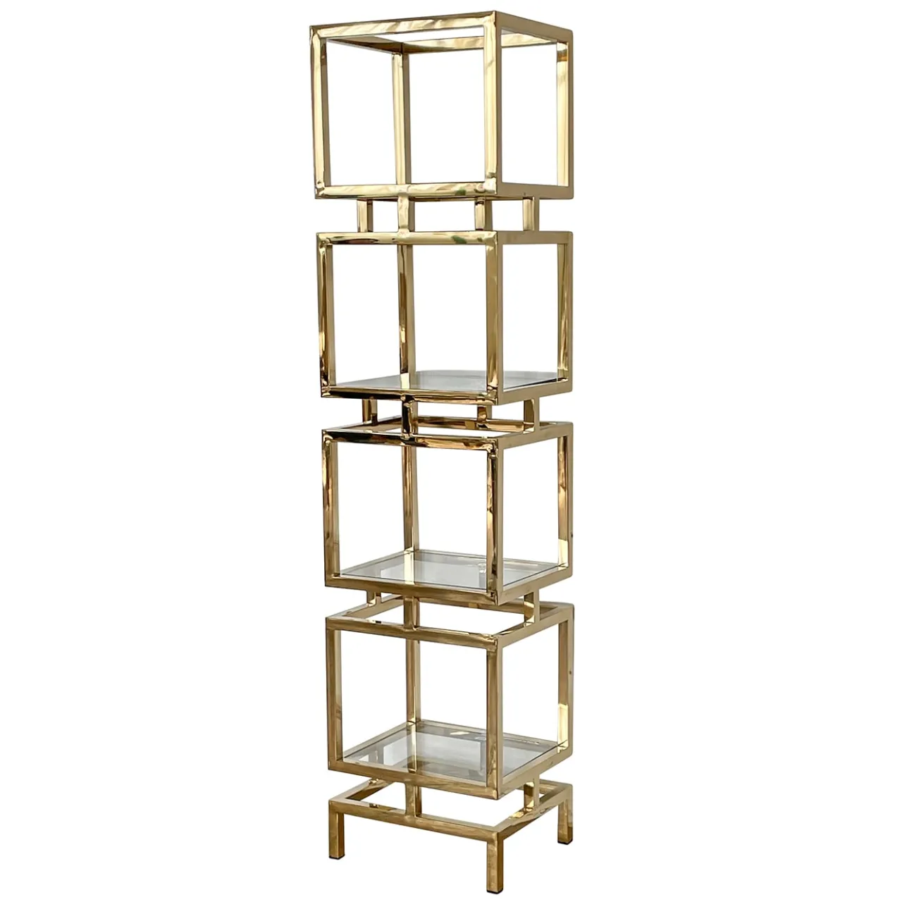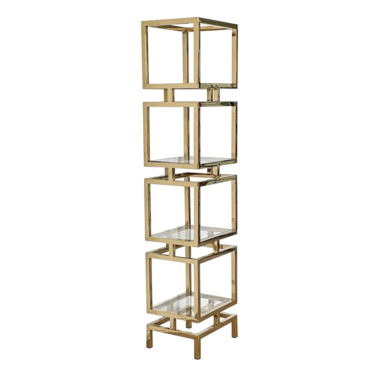Con un’allure totemica e gioiello, questa libreria cattura l’attenzione per il suo impatto lussuoso e altamente decorativo. I quattro ripiani in vetro sono incastonati in blocchi parallelepipedi impilati che compongono la struttura in ottone dorato, il cui design a colonna la rende una soluzione ideale per adattarsi a spazi ridotti. Elegante e versatile, è un pezzo perfetto per raccogliere libri e oggetti da collezione.