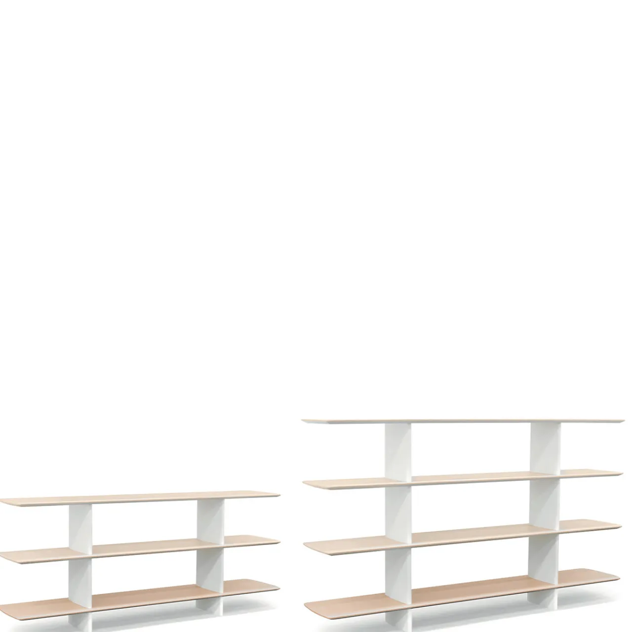 La predilezione per le linee morbide e i volumi armoniosi si riflette nell’estetica delicata di questa libreria. Disponibile anche in altre varianti, presenta uno scheletro in alluminio verniciato in bianco che funge da supporto per i quattro ripiani in rovere leggero con angoli smussati. La base, morbidamente sagomata, è realizzata in Cristalplant® bianco opaco, un materiale sostenibile apprezzato in tutto il mondo per la sua resistenza, flessibilità e morbidezza al tatto.