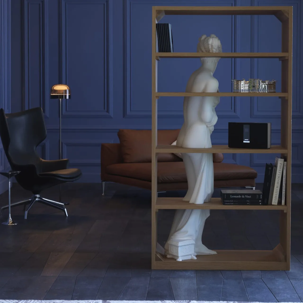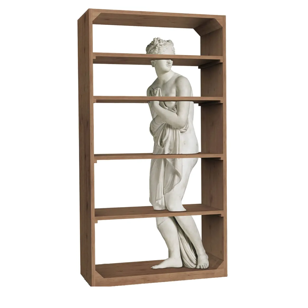 La minuta riproduzione di un’antica statua femminile che attraversa quattro diversi ripiani descrive il design sorprendente ed eclettico di questa libreria. Riflettendo la personalità artistica del suo designer, è caratterizzata da una struttura in legno duro dalle linee pulite che fa da contraltare alla maestosità della statua in marmo bianco. Un vero e proprio pezzo forte per gli arredamenti contemporanei.