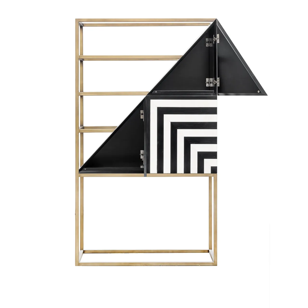 Questa singolare libreria, che fonde design e funzionalità, ha un design bifacciale che le permette di essere utilizzata come divisorio indipendente in interni in stile loft o di essere collocata contro una parete spoglia come punto focale artistico. Un esercizio di geometria visiva, questa libreria comprende elementi aperti e chiusi. Caratterizzata da ripiani in cristallo, la sottile struttura metallica è rifinita in ottone spazzolato per creare un contrasto cromatico con l’intarsio a spina di pesce realizzato a mano in legno di pero bianco e nero che orna i sei pannelli delle ante. Personalizzazione disponibile su richiesta.
