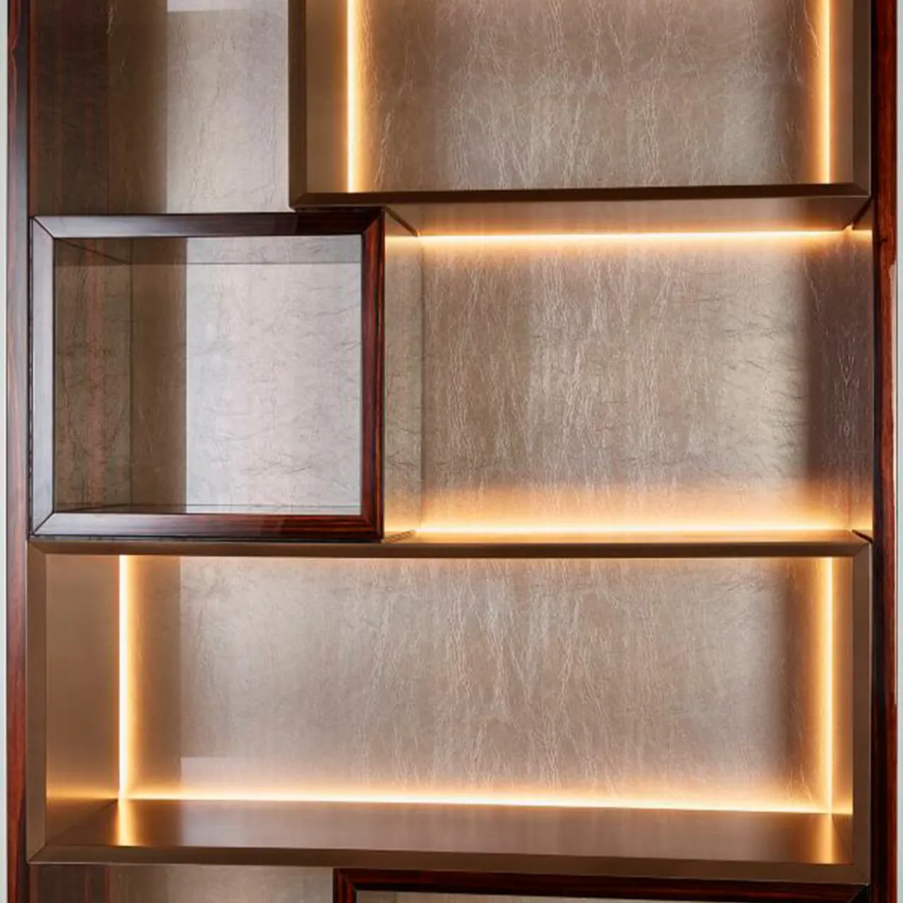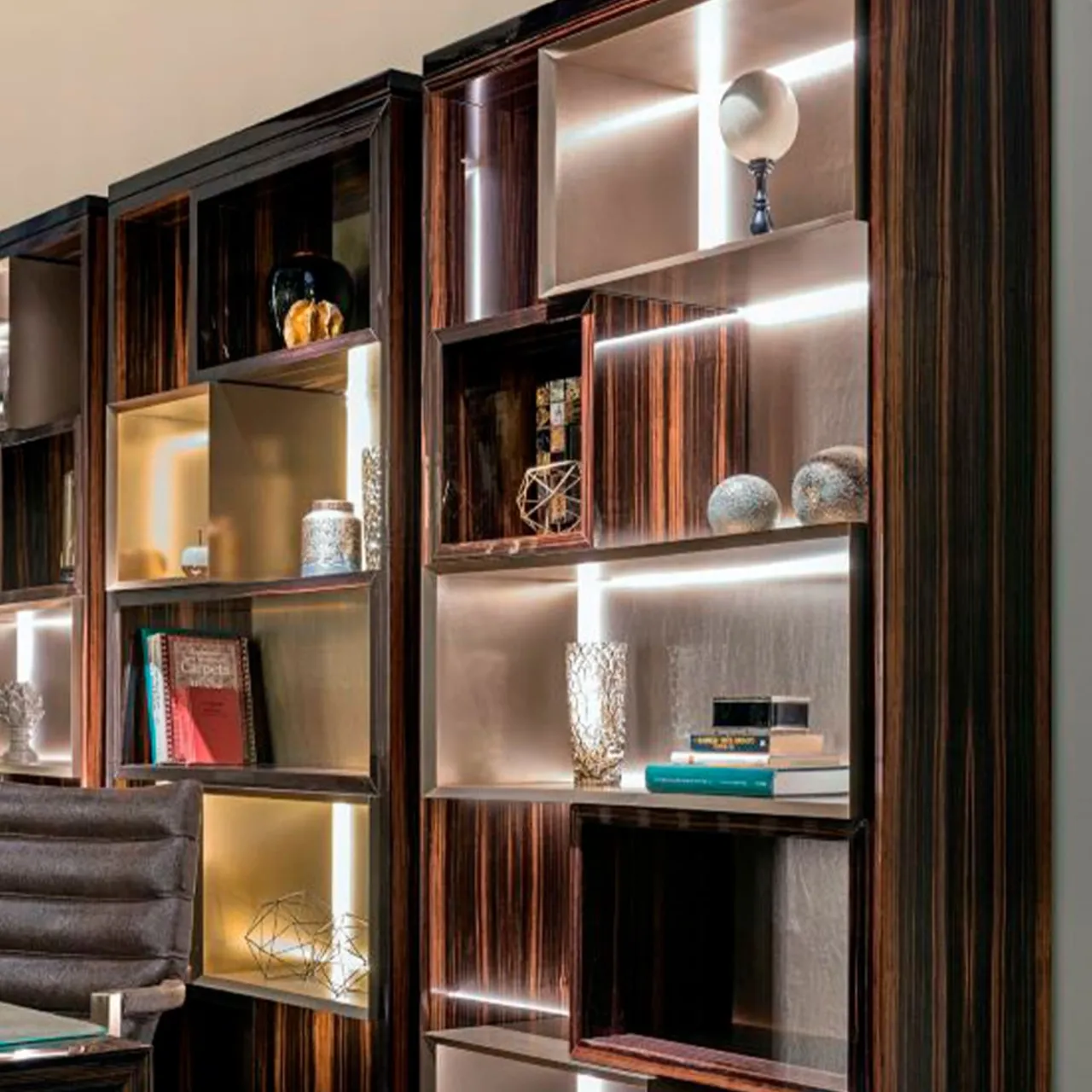 Questa libreria reinterpreta la forma geometrica più pura: il cubo. Una tridimensionalità semplice e monocromatica che presenta tutte le possibili combinazioni di cubi e quadrati aperti e chiusi.