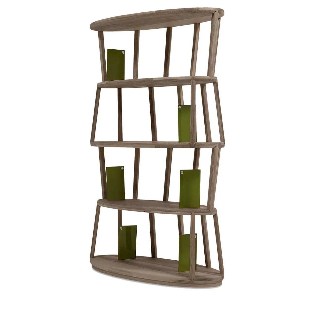 Questa straordinaria libreria fa parte della collezione Raven, caratterizzata da pezzi di diverse altezze realizzati in legno di noce Canaletto con una finitura naturale che creano la struttura verticale, sostenendo le mensole orizzontali in cristallo con una forma ovale allungata. In questo caso le mensole sono sei e sono racchiuse nella struttura in legno che presenta elementi alternati che si inclinano verso l’interno e verso l’esterno per dare un effetto dinamico al pezzo. Sia da sola, sia combinata con altri pezzi della stessa serie, questa libreria sarà un oggetto d’arredo funzionale di grande impatto visivo.