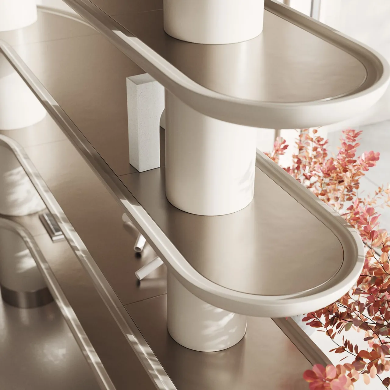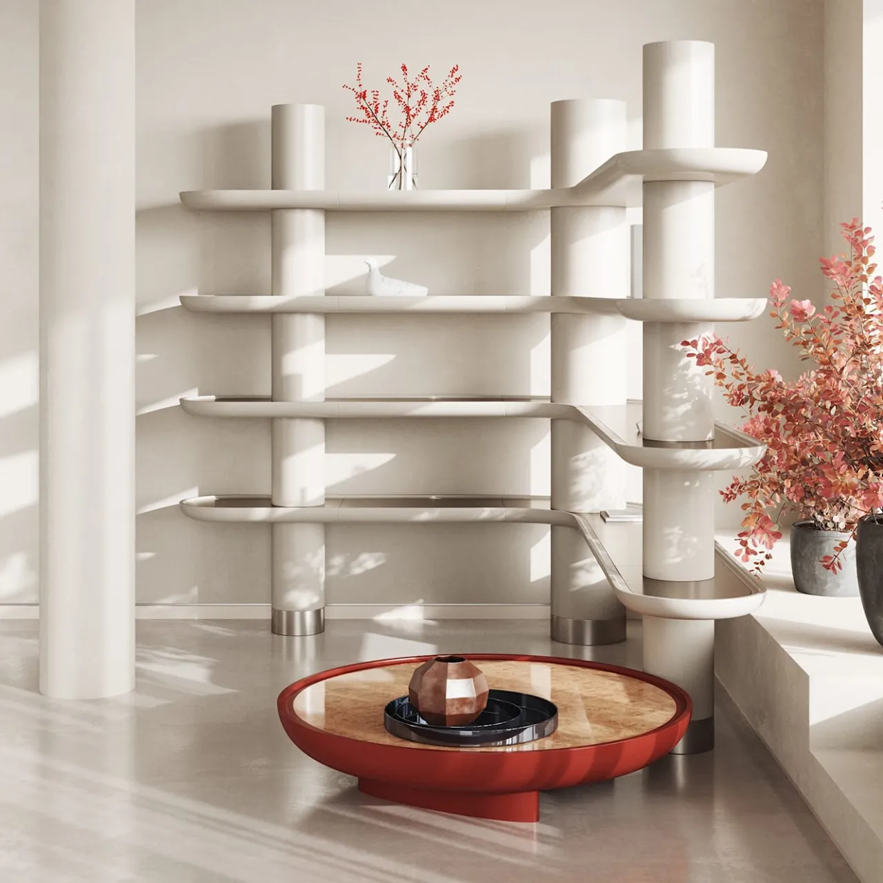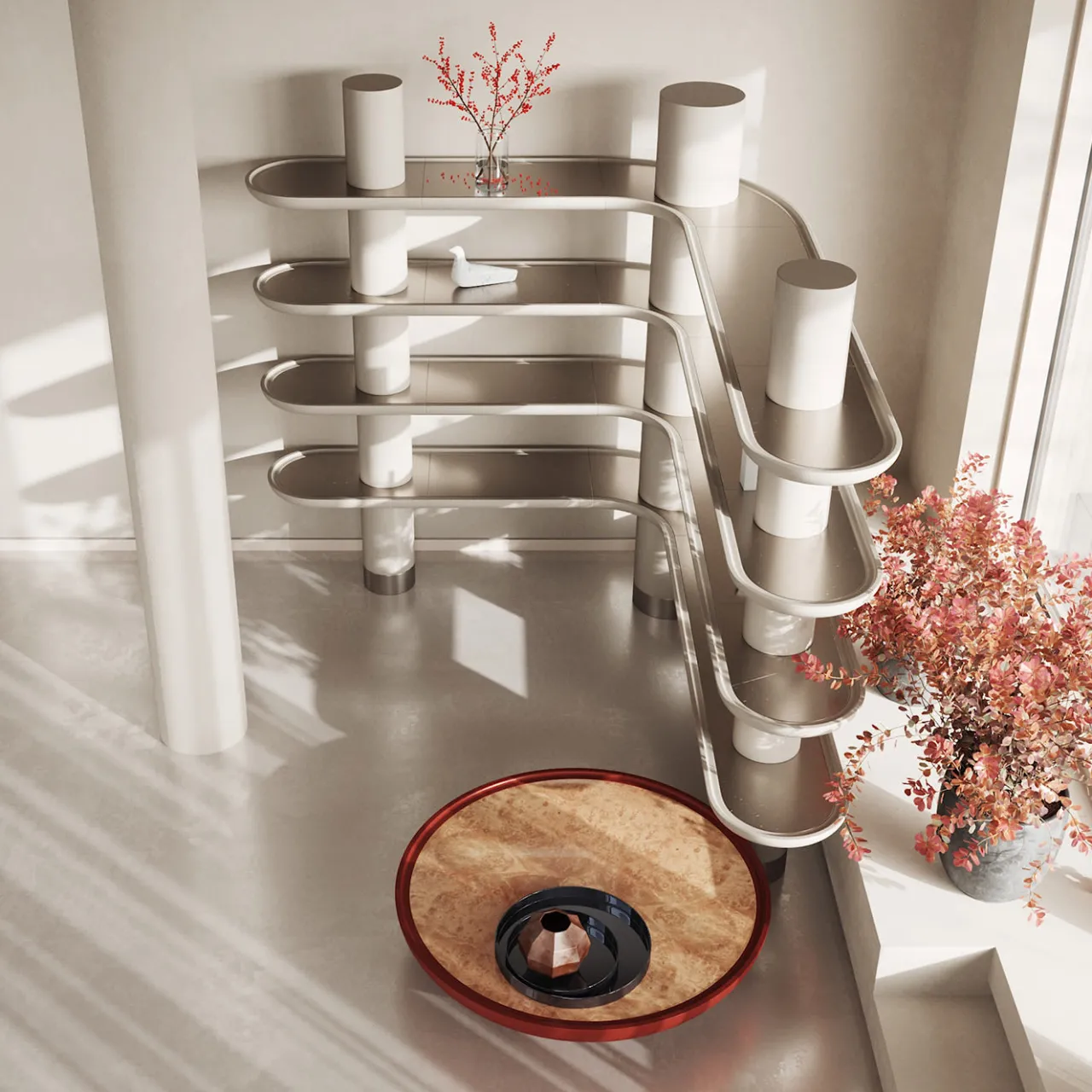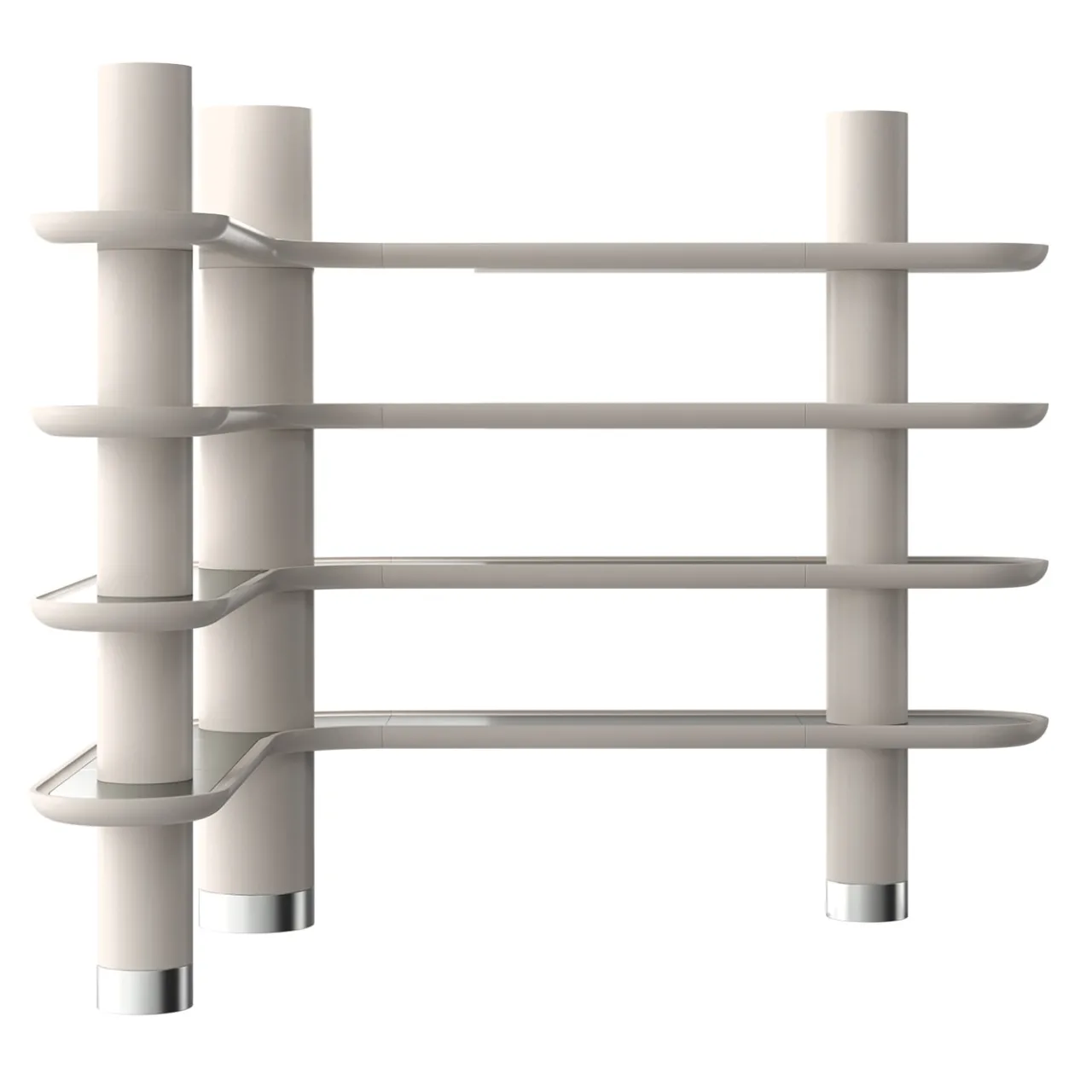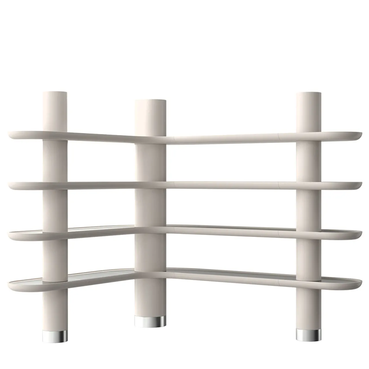 Esigenze contenitive ed estetiche sono superbamente sintetizzate in questa sofisticata libreria. Questa libreria angolare, che fa parte della Collezione Mina, è composta da ripiani laccati Greige opaco con inserti e piedini in inox satinato.
