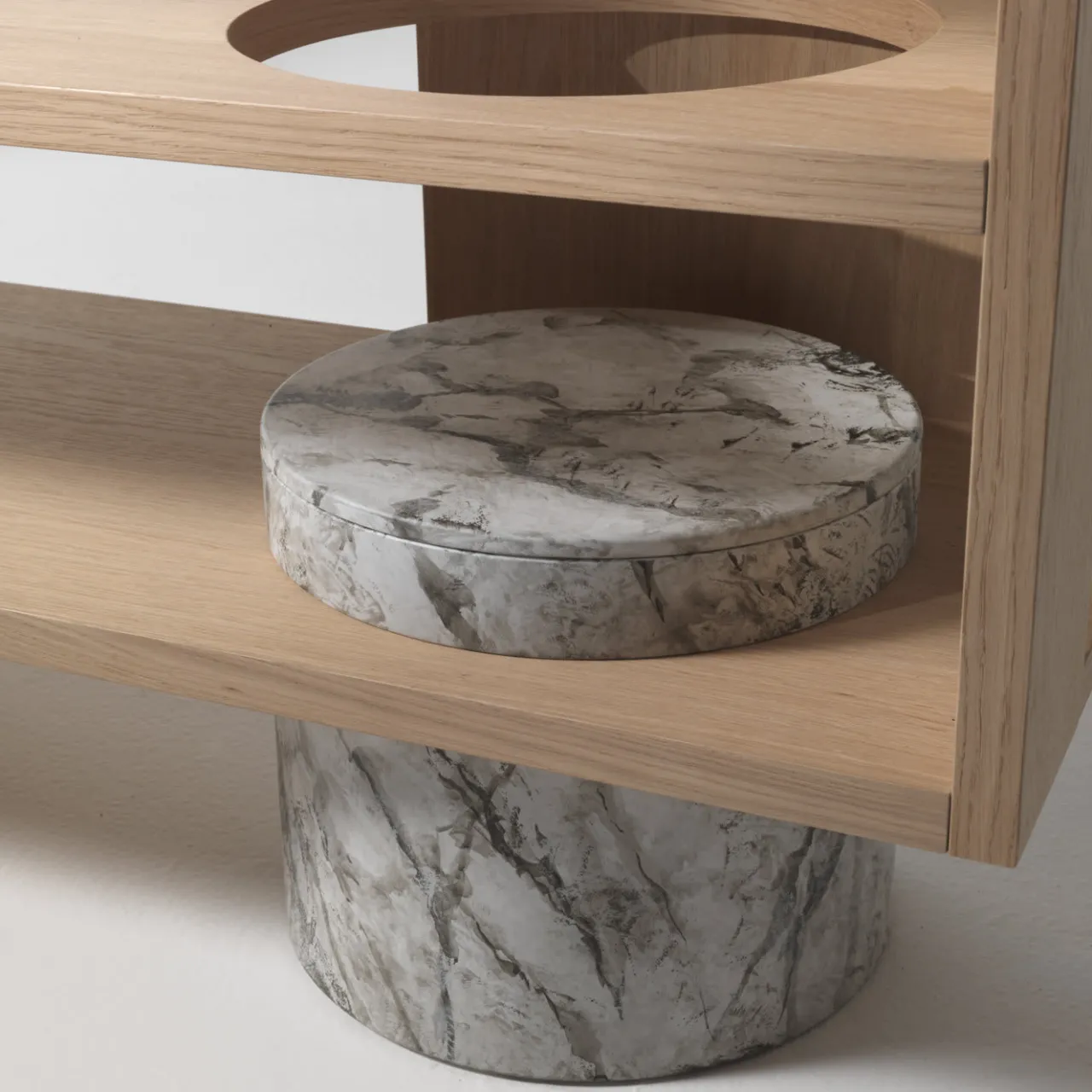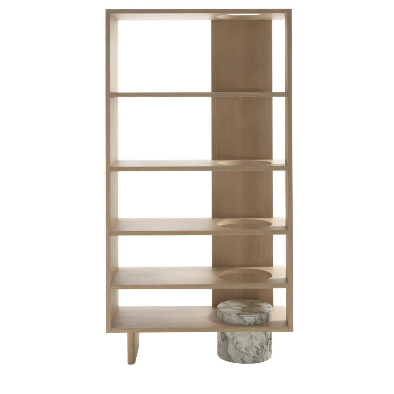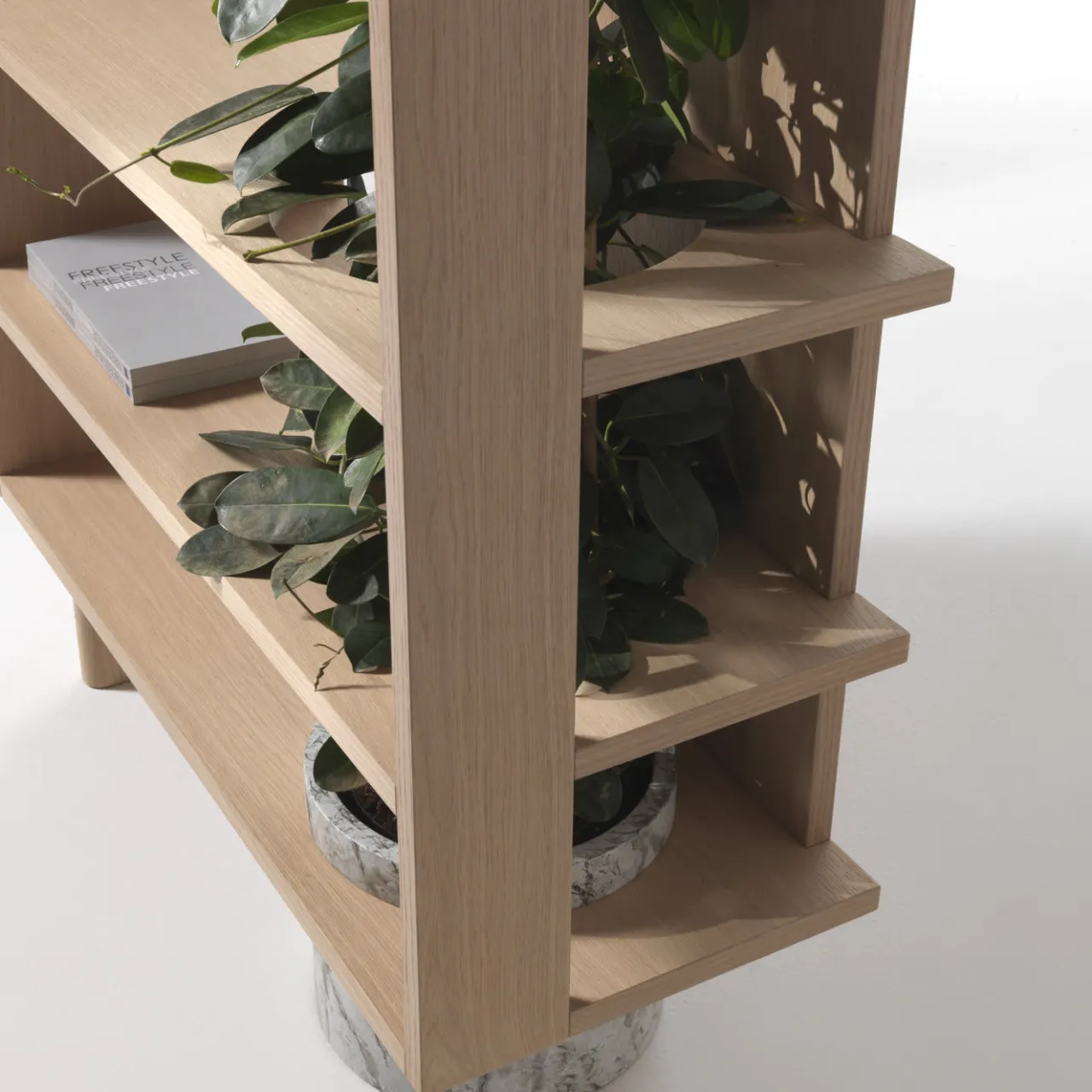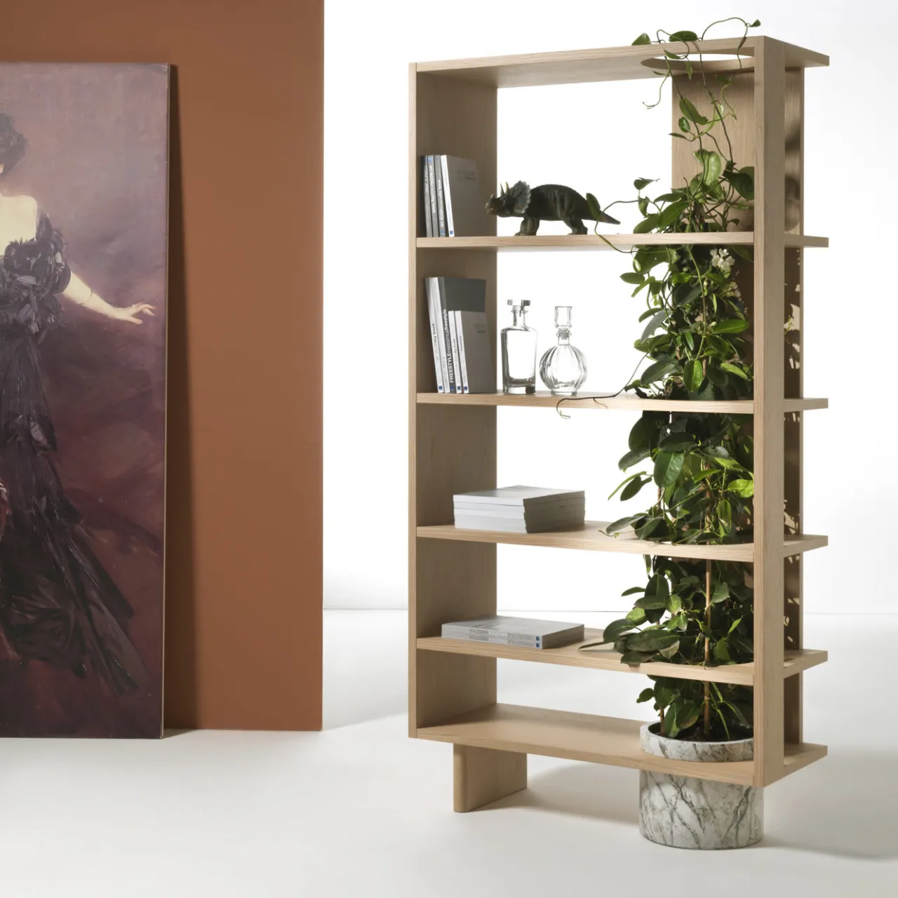 I ripiani di questa elegante libreria, disponibile in rovere o in noce canaletto, sono forati su un lato come se un asteroide vi fosse caduto sopra lasciando un buco. Lo spazio può essere utilizzato per una pianta o una scultura verticale, in modo che libri e oggetti possano coesistere. Il portavaso in basso è in legno verniciato con effetto marmo.