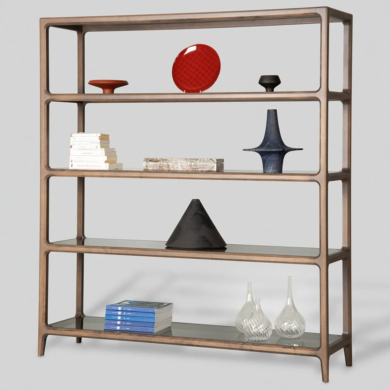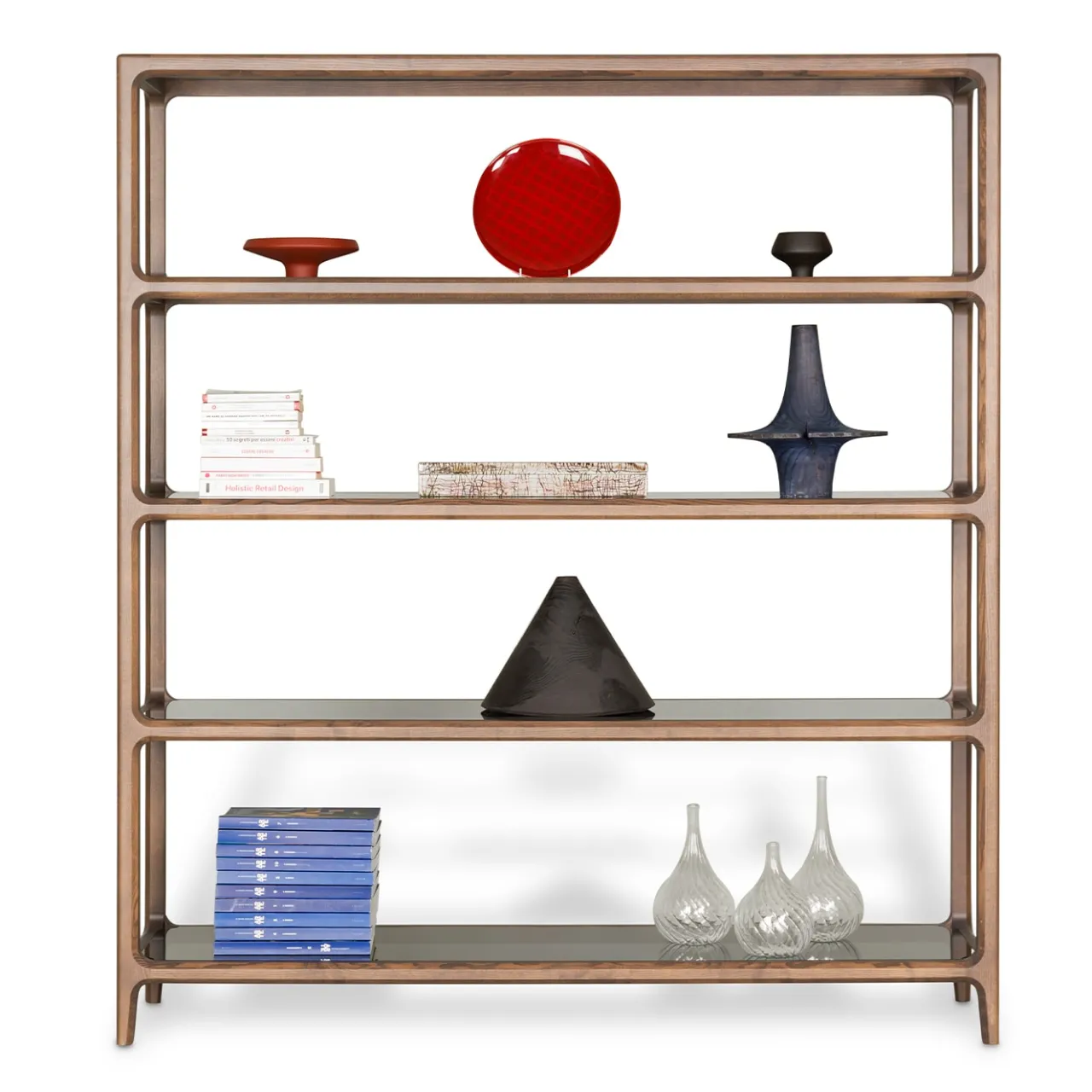 Progettata per offrire un elegante spazio espositivo a libri e oggetti da collezione, questa superba libreria è realizzata in frassino massiccio con una splendida finitura in noce. La caratteristica principale di questo pezzo sono i quattro ripiani in vetro, la cui superficie riflettente aggiunge luminosità all’intera silhouette. Su richiesta, i ripiani sono disponibili anche in ceramica. Disegnato da Libero Rutilo. Eventuali sfumature di colore o venature, del marmo o della ceramica, possono variare per ogni prodotto. Poiché ogni mobile è realizzato artigianalmente, la scelta dei materiali naturali viene fatta per ogni singolo mobile creato. Le foto presentate sul portale sono da considerarsi indicative, in quanto ogni pezzo è unico e irripetibile rispetto agli altri della stessa collezione, ciò ne contraddistingue l’originalità e l’artigianalità.