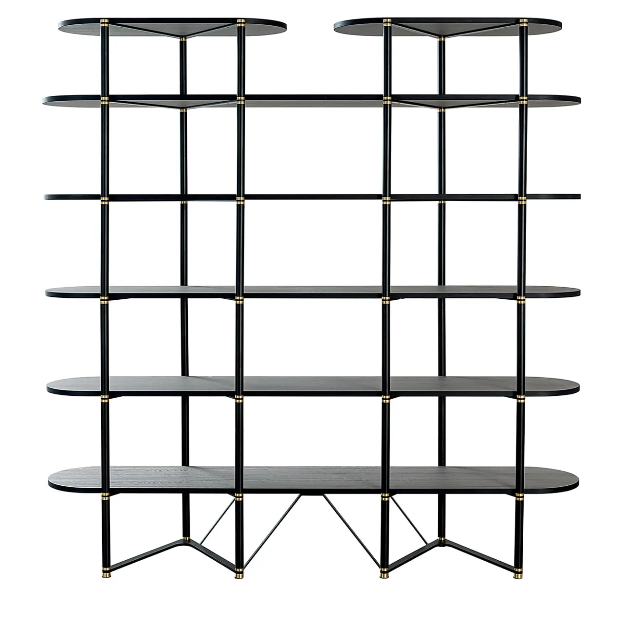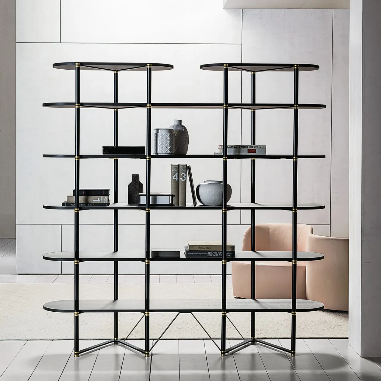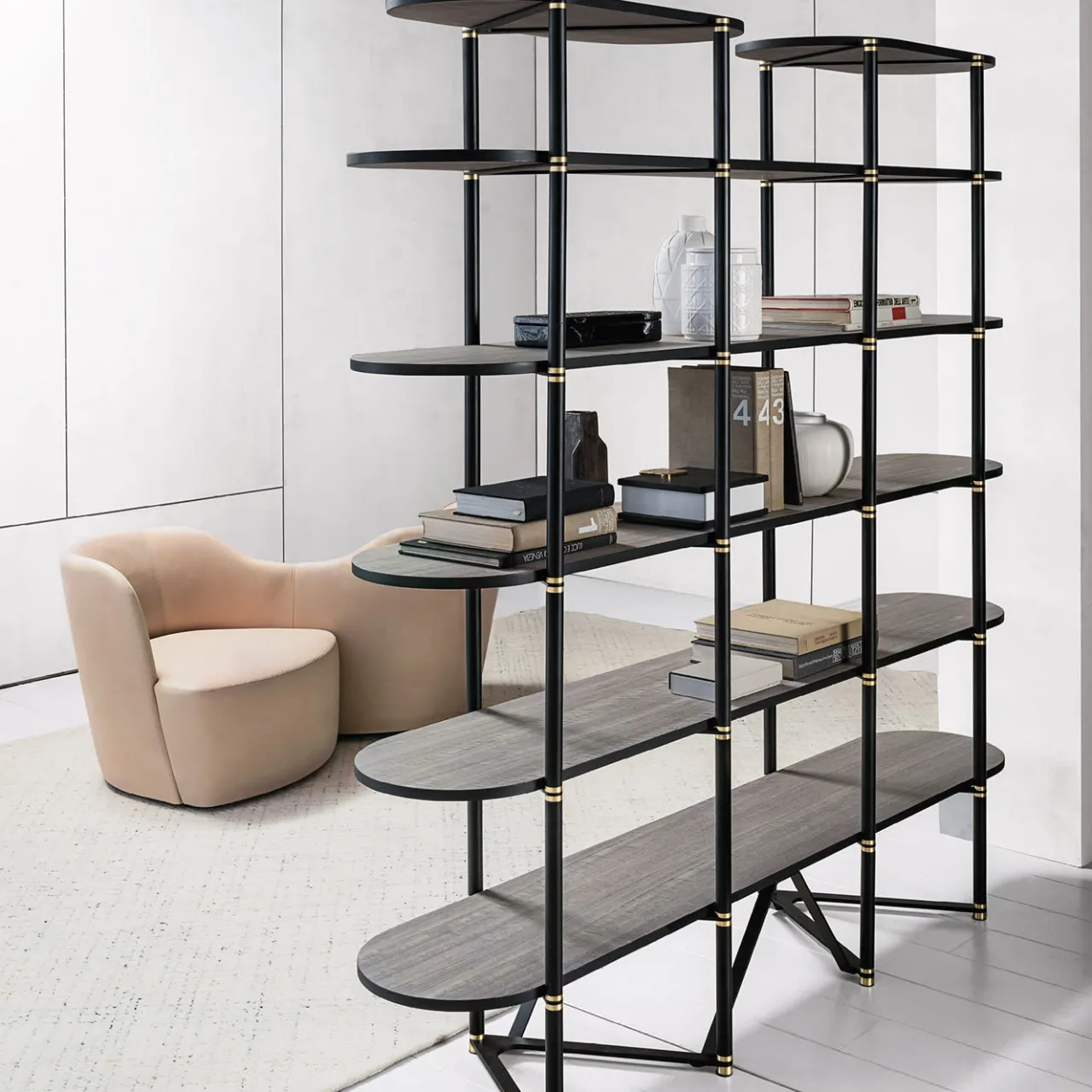 La libreria presenta una struttura in metallo verniciato nero opaco con eleganti dettagli in ottone, che aggiungono un tocco di raffinatezza. I ripiani sono realizzati con pannelli di particelle di legno, rivestiti con un’impiallacciatura di eucalipto greige frisé per un look raffinato e naturale. Perfetto per gli interni moderni, combina elementi industriali e organici, offrendo stile e funzionalità. Un pezzo senza tempo per qualsiasi spazio.