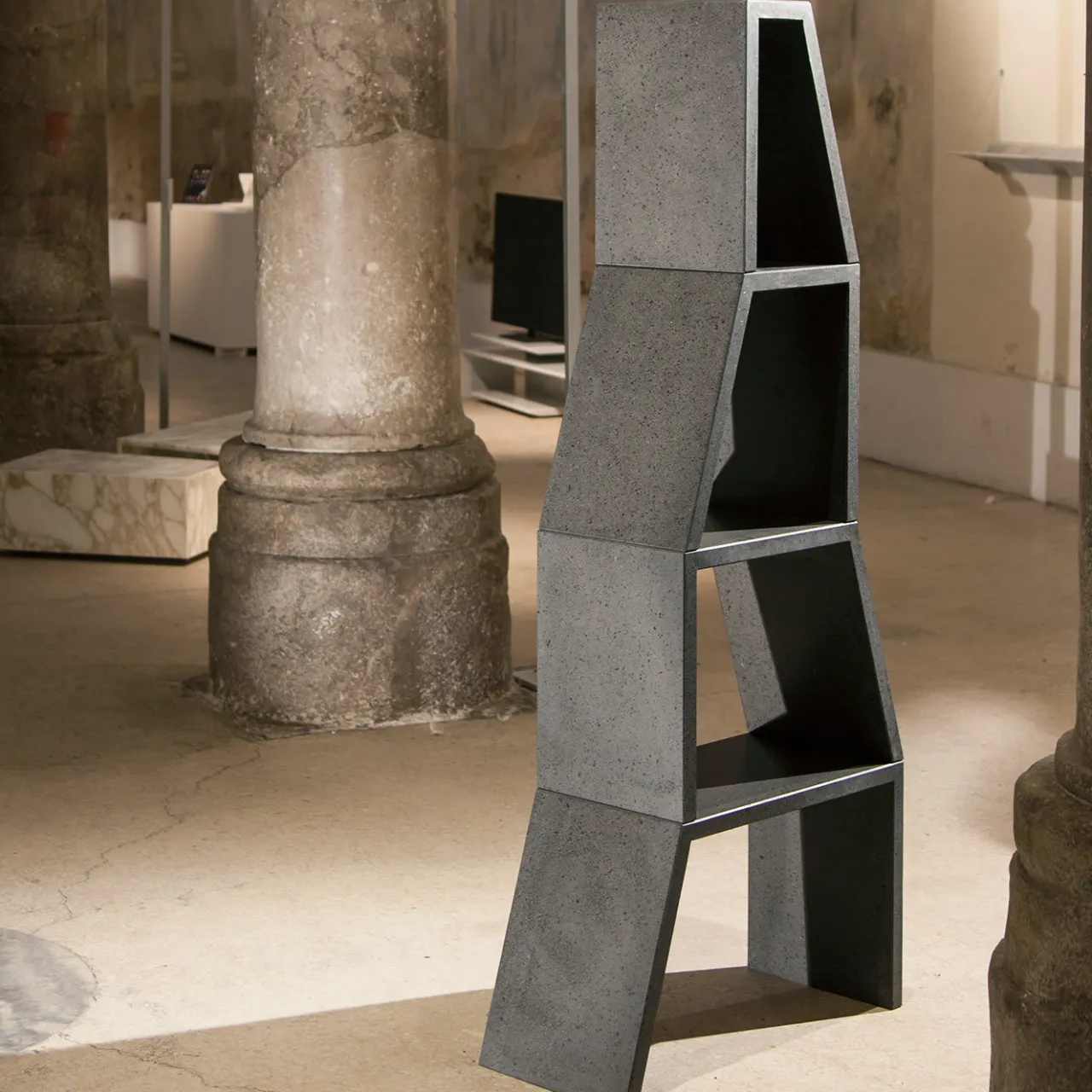 Una serie di componenti modulari asimmetrici in pietra lavica nera sono impilati l’uno sull’altro per creare questa libreria suggestiva e versatile. I moduli sono stati progettati per essere assemblati in varie forme per una varietà di usi diversi, si prega di chiedere al Concierge per i dettagli.