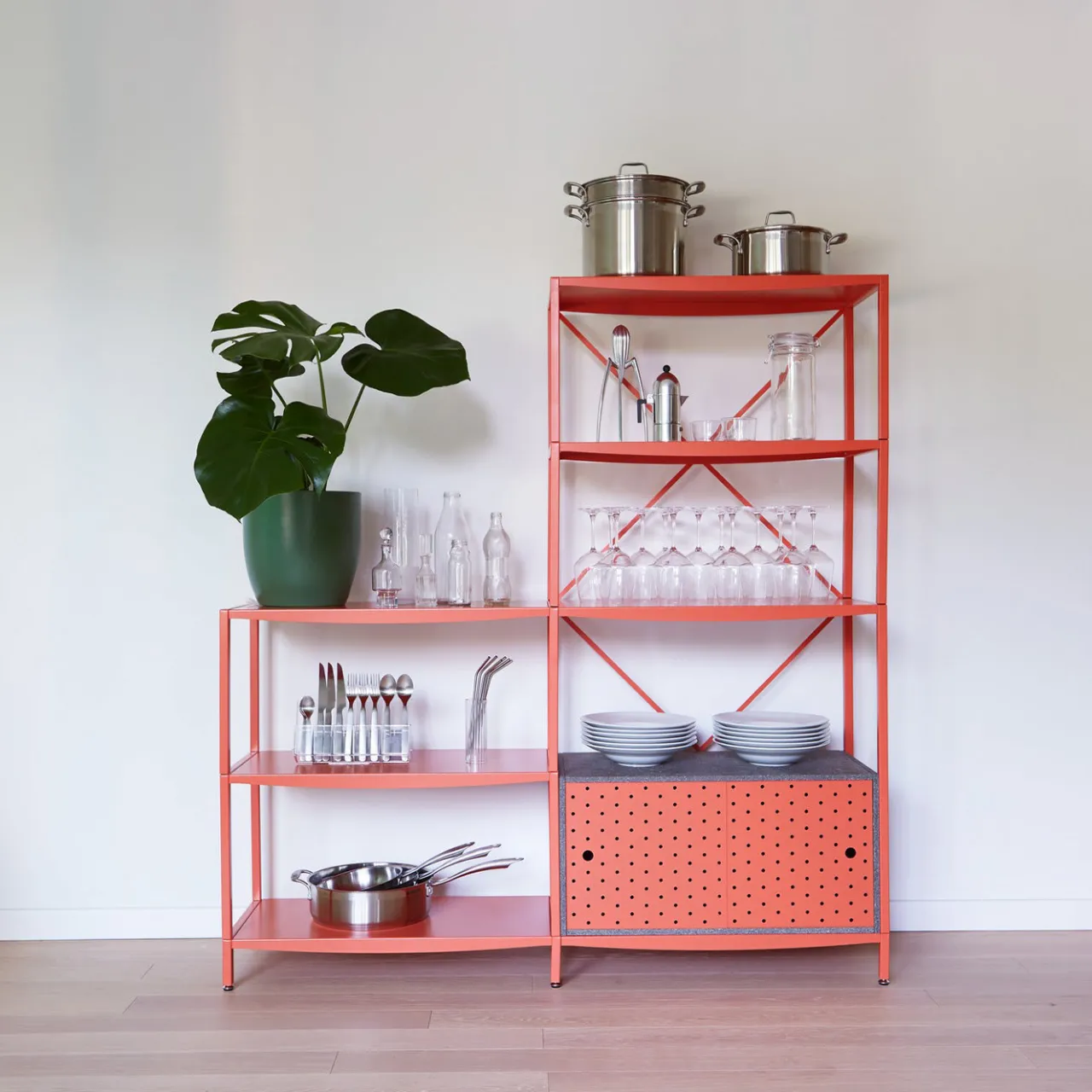 Una sofisticata libreria in metallo, con un’infinita combinazione di moduli e accessori da smontare e ricomporre, secondo le diverse esigenze.