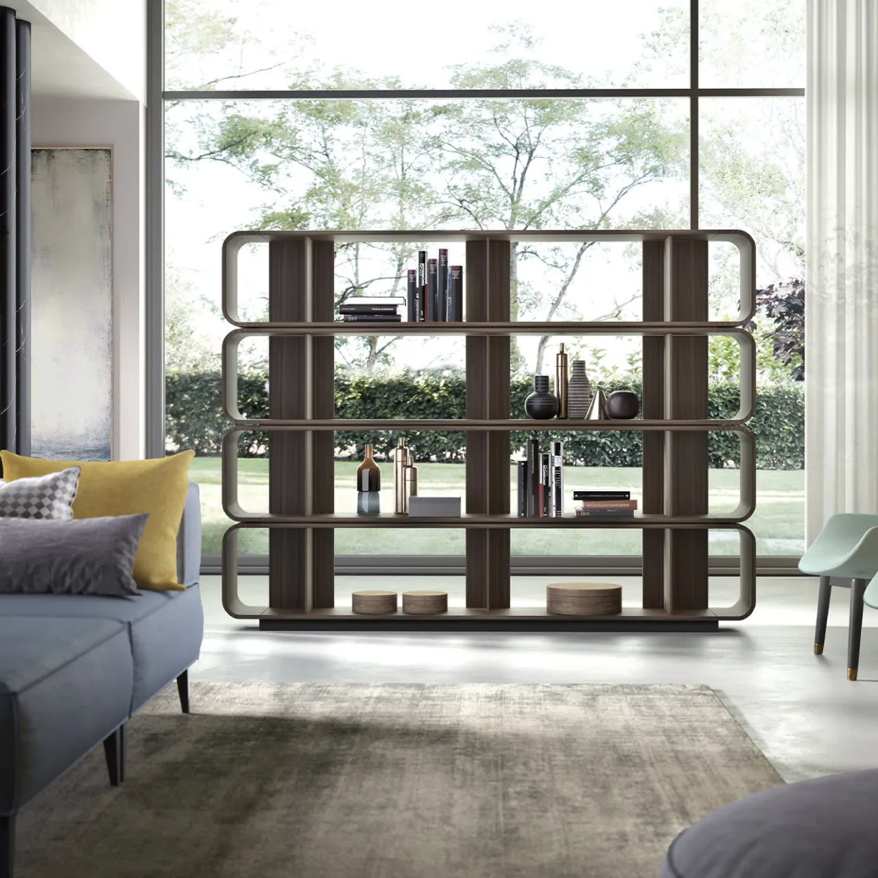 Splendido pezzo della designer Manuela Pelizzon, questa libreria sarà al centro dell’attenzione in un ambiente contemporaneo. Elegante e moderna, le sue linee arrotondate ed eleganti sono realizzate a mano in noce canaletto. Presenta quattro ripiani orizzontali, divisi in due scomparti, che si uniscono per formare una silhouette di grande effetto. Questo design può essere personalizzato nelle dimensioni, si prega di consultare il Concierge per ulteriori informazioni.