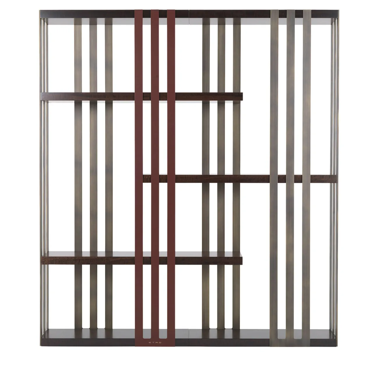 Un mix versatile e superbo di elementi in perfetto stile Etro Home Interiors: la struttura in metallo bronzato patinato con dettagli in finitura bordeaux, i ripiani in legno di eucalipto frisè affumicato e la forma che rimanda alla lettera iniziale del logo Etro contribuiscono a esprimere lo spirito poliedrico del marchio. Libreria Struttura in metallo patinato bronzo con dettagli in finitura rosso ciliegia. Ripiani in legno di eucalipto frisè affumicato.
