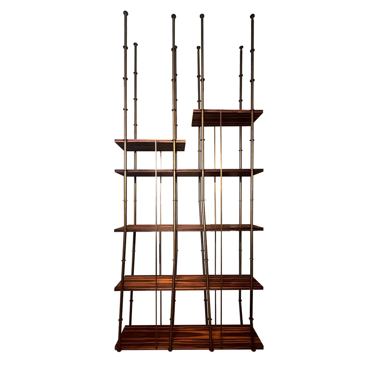 Libreria modulare in metallo galvanizzato con effetto ottone brunito. Presenta elementi verticali e ripiani in ebano a macchia larga. Il design ricorda gli steli di bambù, con ripiani che poggiano su “nodi” a intervalli di 60 cm. Su richiesta, è possibile aggiungere altri ripiani ai nodi liberi per aumentare la capacità. La libreria è personalizzabile in altezza e larghezza.