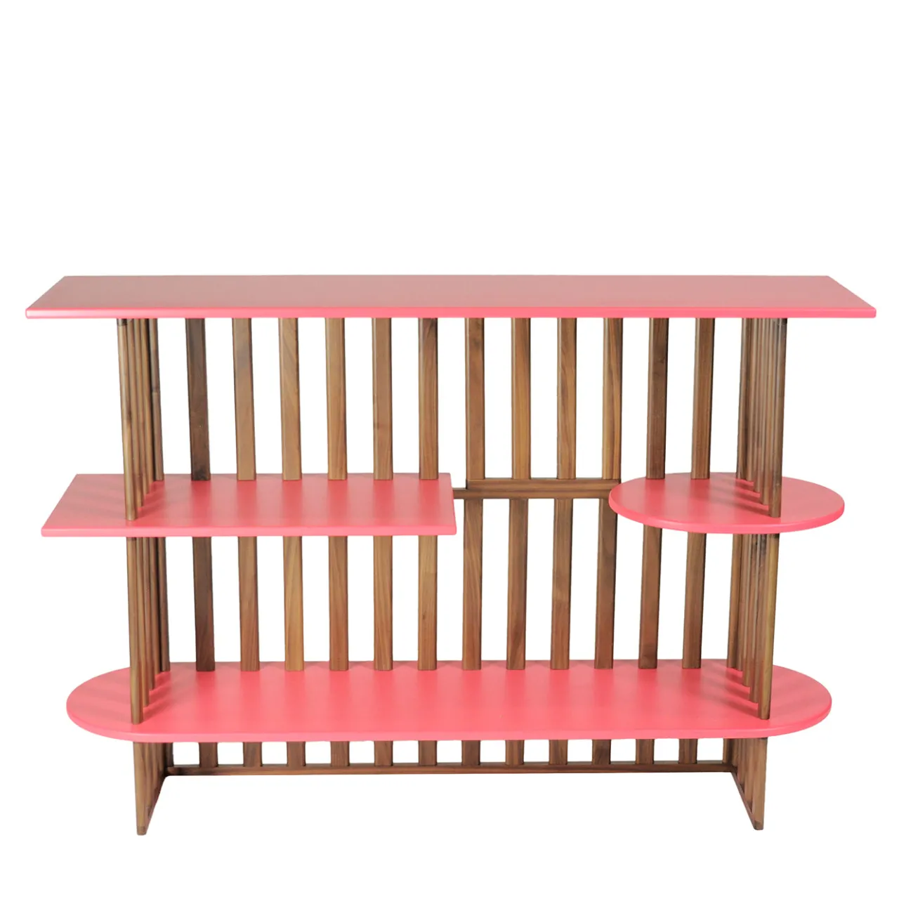 La libreria Lido a tre livelli presenta un design distintivo ispirato all’architettura dei lido veneziani dei primi del ‘900, che fonde listelli di legno verticali con scaffali disposti in modo asimmetrico. Gli scaffali sono rifiniti con un rivestimento opaco e resistente ai graffi in un vivace rosa calypso, aggiungendo un tocco giocoso ma raffinato. La sua forma modulare supporta diverse disposizioni domestiche e offre opzioni di stoccaggio versatili mantenendo un’estetica equilibrata e senza tempo.