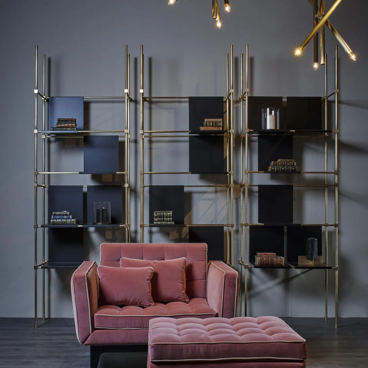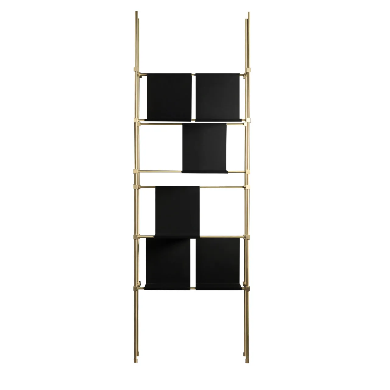 Il design estremamente minimale ma elegante di questa libreria modulare di Filippo Montaina sarà un elemento decorativo in qualsiasi spazio contemporaneo. La struttura esterna in metallo è in ottone satinato e i ripiani sono verniciati a polvere. I colori e i materiali contrastano per un pezzo di sicuro effetto. Disponibile anche con struttura in metallo nero.