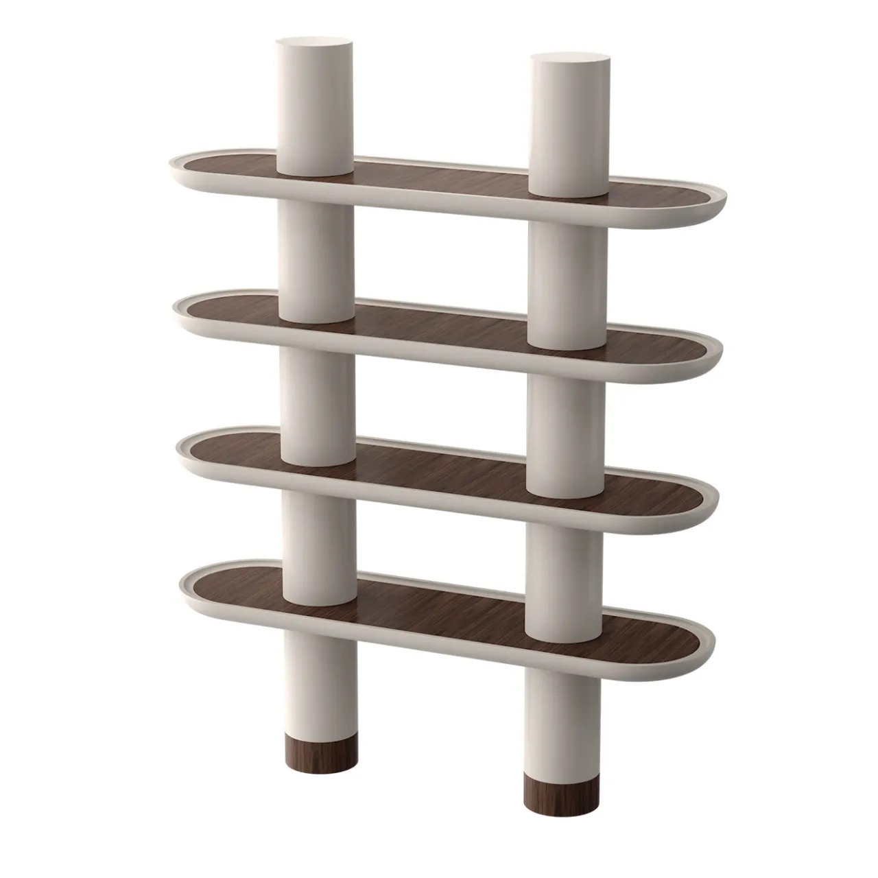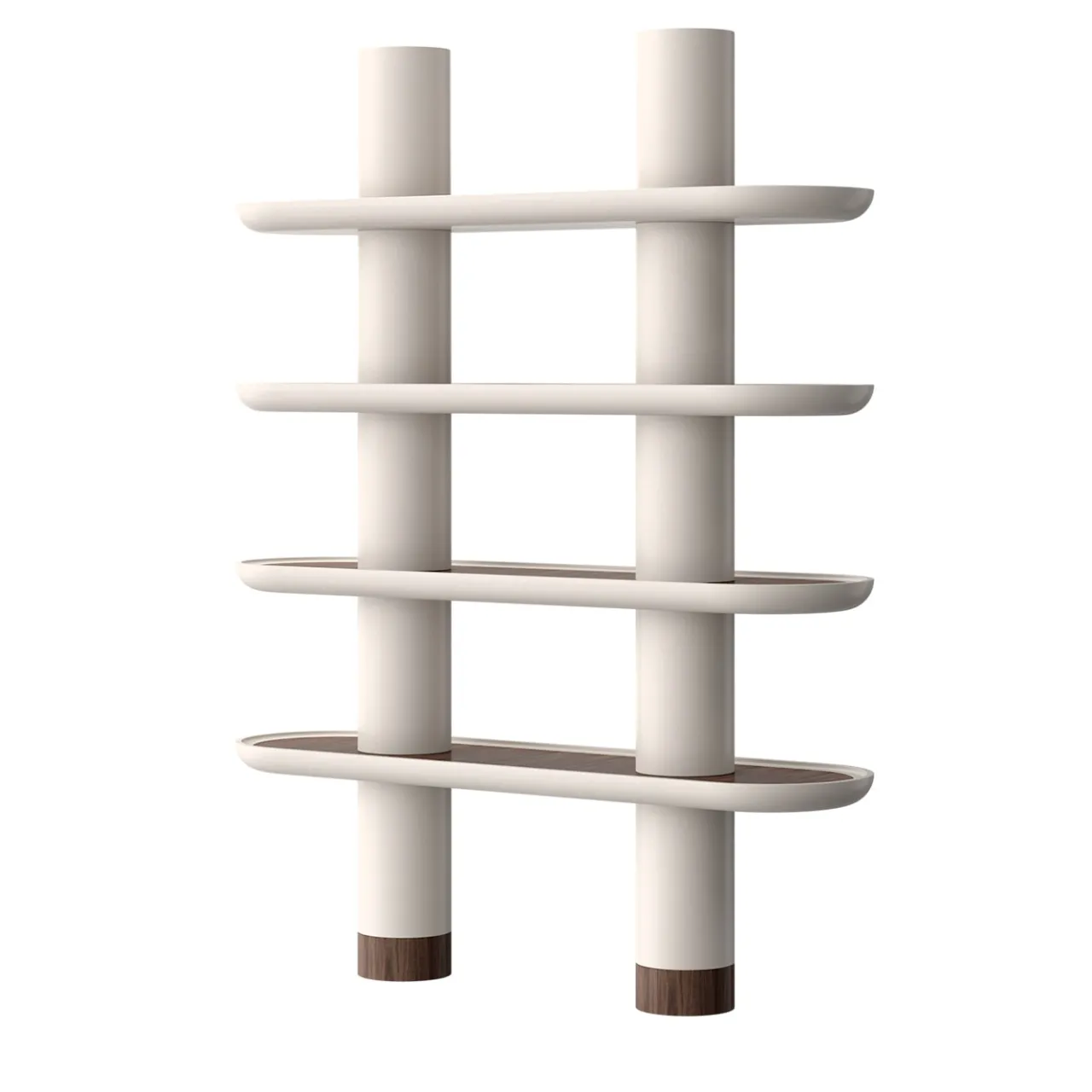 Delicatezza e audacia convivono senza sforzo in questa sofisticata libreria in legno, i cui quattro ripiani sono caratterizzati da estremità curve di eleganza contemporanea. Laccata in bianco per un impatto luminoso, la struttura vanta inserti in legno naturale sulla superficie interna dei ripiani – dettagli disponibili anche nelle varianti in ceramica o in acciaio inox. Completano il design le audaci colonne cilindriche, che svolgono una funzione strutturale cruciale senza rinunciare allo stile.