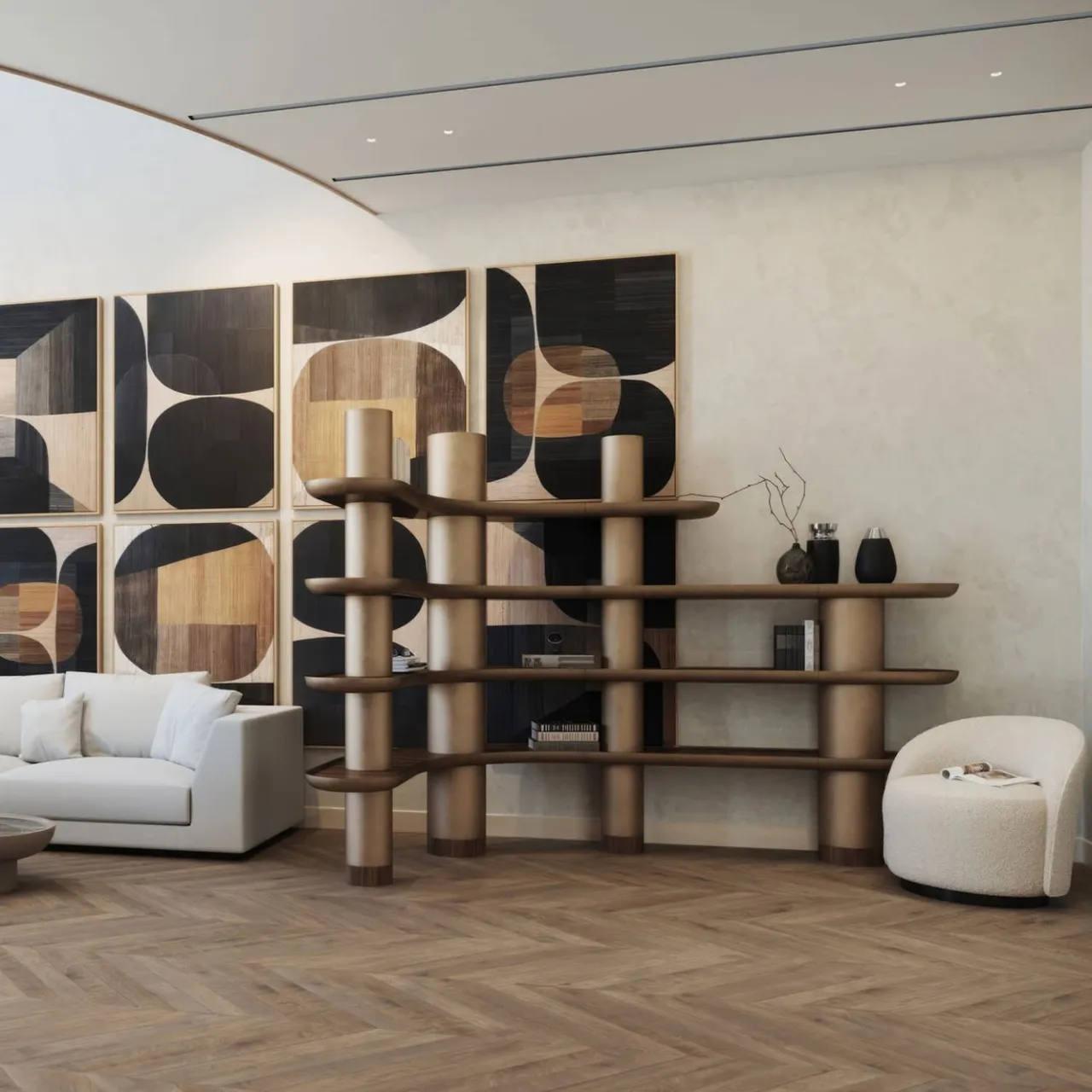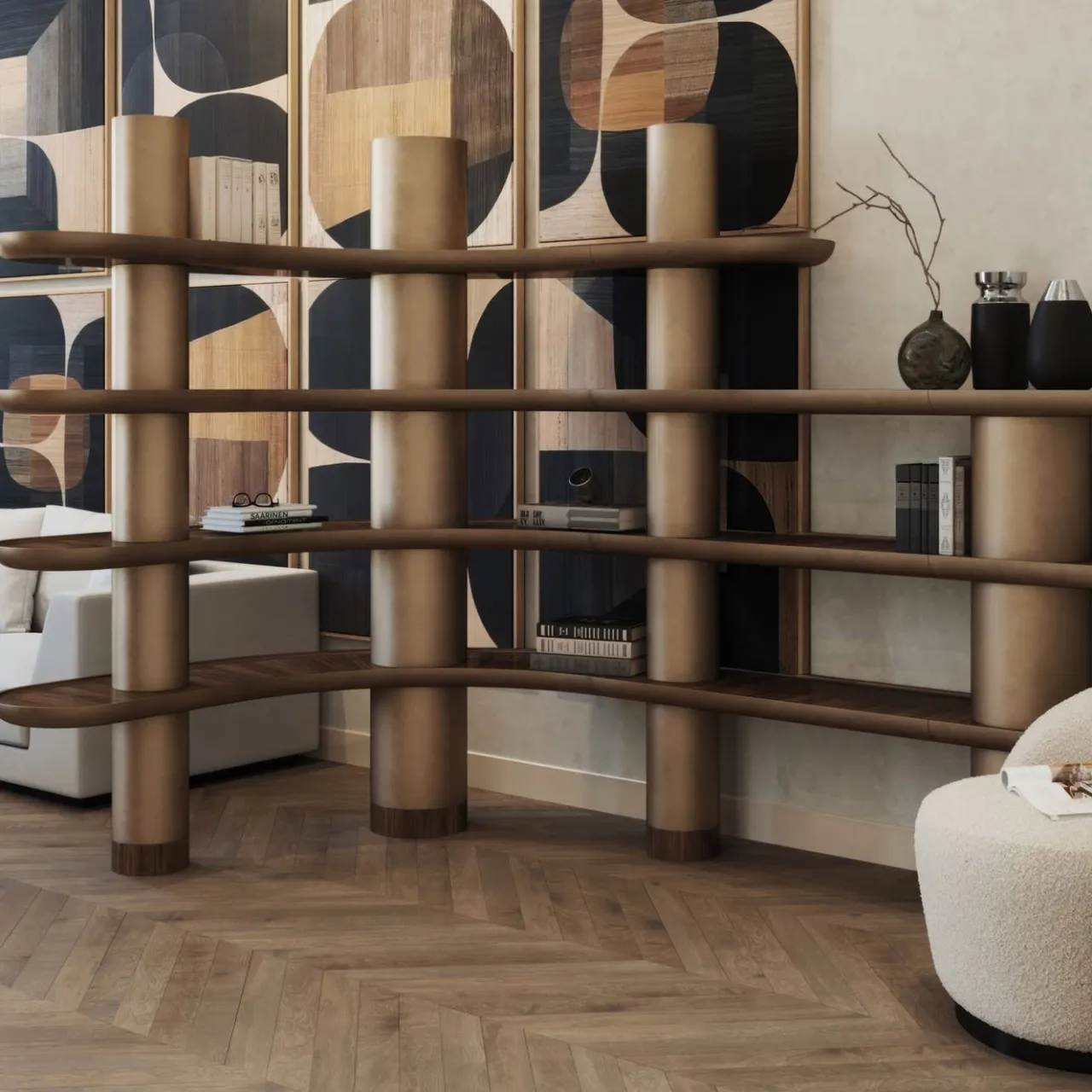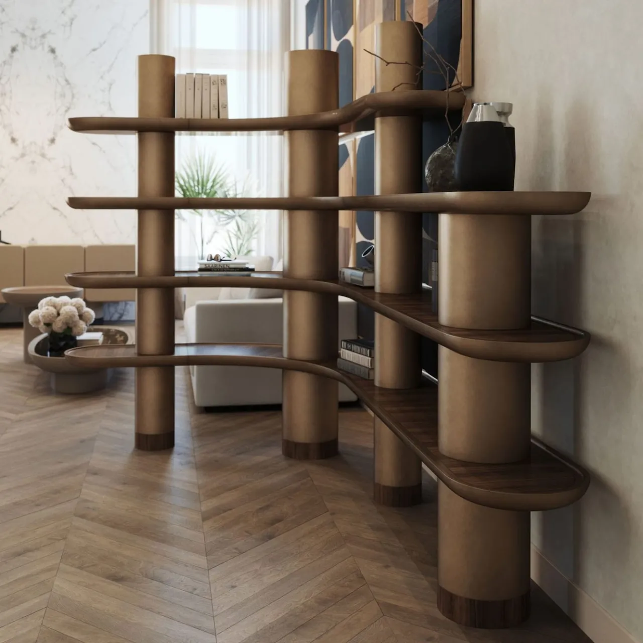 Questa raffinata libreria è dotata di tre e quattro livelli di ripiani con angolo arrotondato R100. Presentata in una finitura laccata bronzo vintage realizzata a mano, include inserti in impiallacciato Noce Noce.