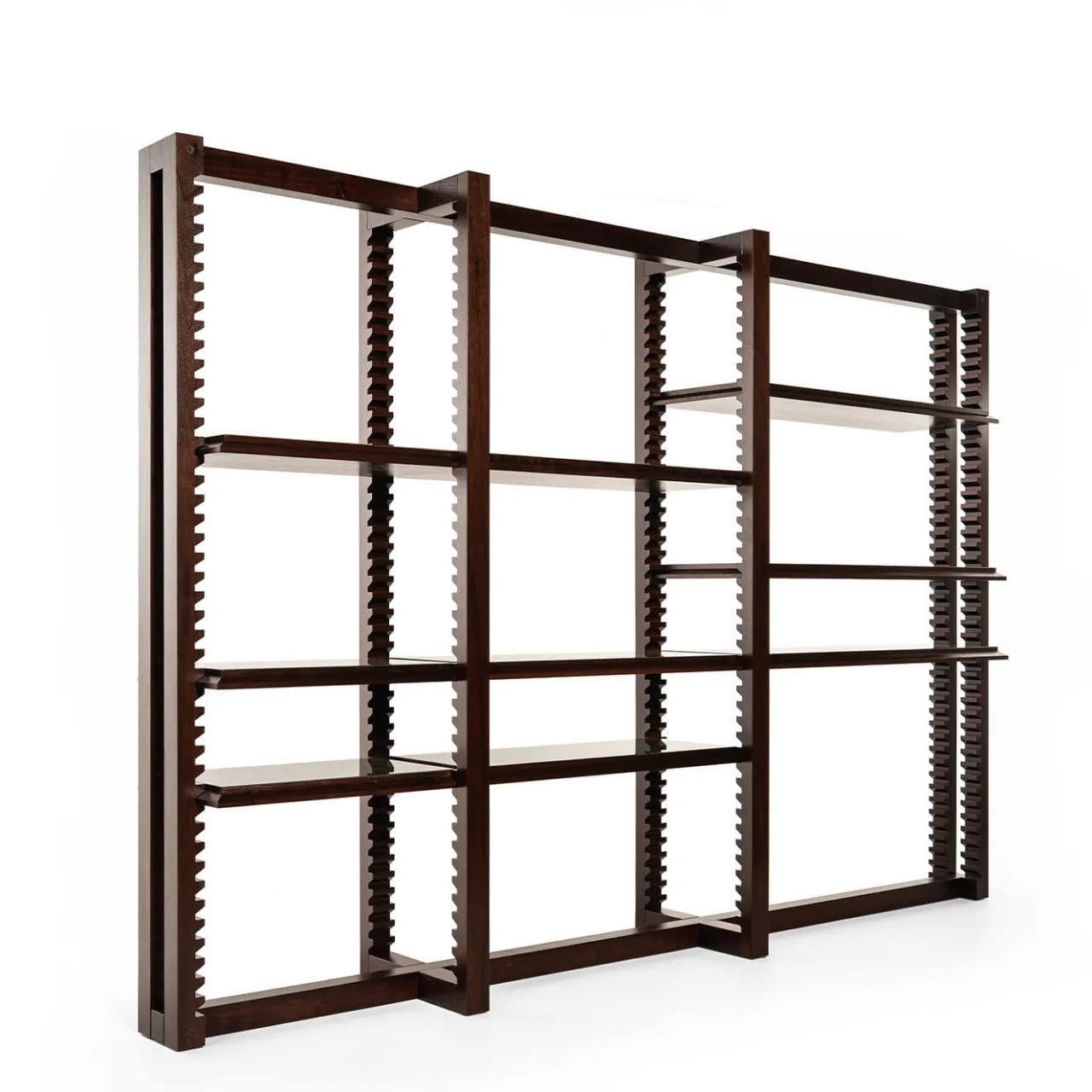La libreria modulare Ritmica di Storagemilano è caratterizzata da un design bifacciale con ripiani regolabili sostenuti da un meccanismo a cremagliera realizzato in noce massiccio con un’anima metallica rinforzata per una maggiore stabilità. I ripiani sono in legno di noce tinto scuro con piani laccati lucidi in verde, facilmente smontabili e riposizionabili per configurazioni personalizzabili. Le finiture raffinate e il design pratico permettono di adattarsi perfettamente a diversi spazi abitativi e professionali.