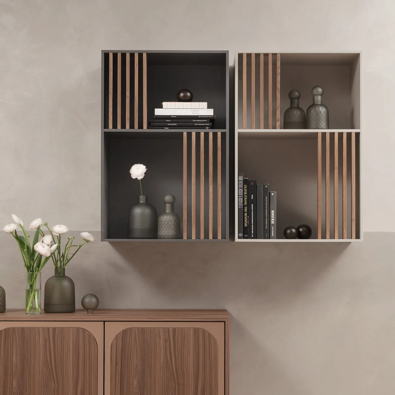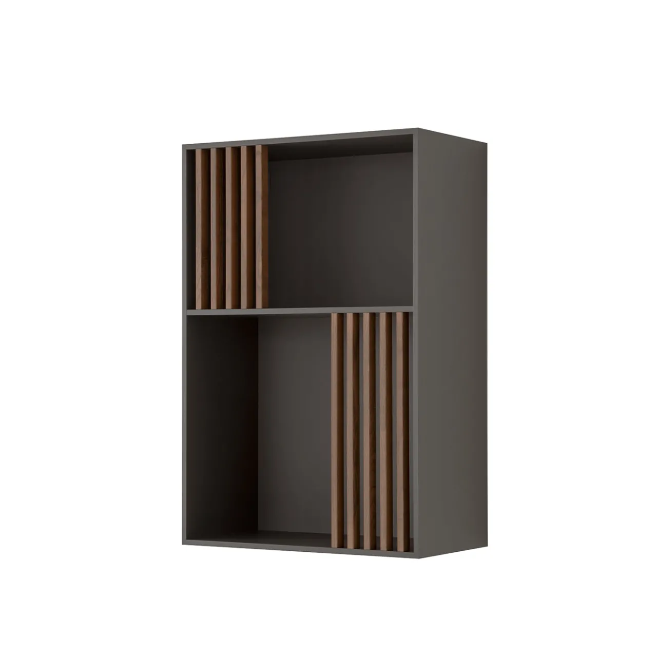 La libreria Mondrian grigia presenta una struttura di medie dimensioni rifinita in impiallacciatura PET grigia vulcanica a tocco morbido. È accentuata da listelli verticali in legno massello di frassino tinto noce che creano un ritmo visivo distintivo attraverso i compartimenti. La silhouette rettangolare pulita e le mensole divisorie offrono un’archiviazione versatile per libri e oggetti decorativi, introducendo al contempo un elemento moderno e scultoreo negli spazi interni.