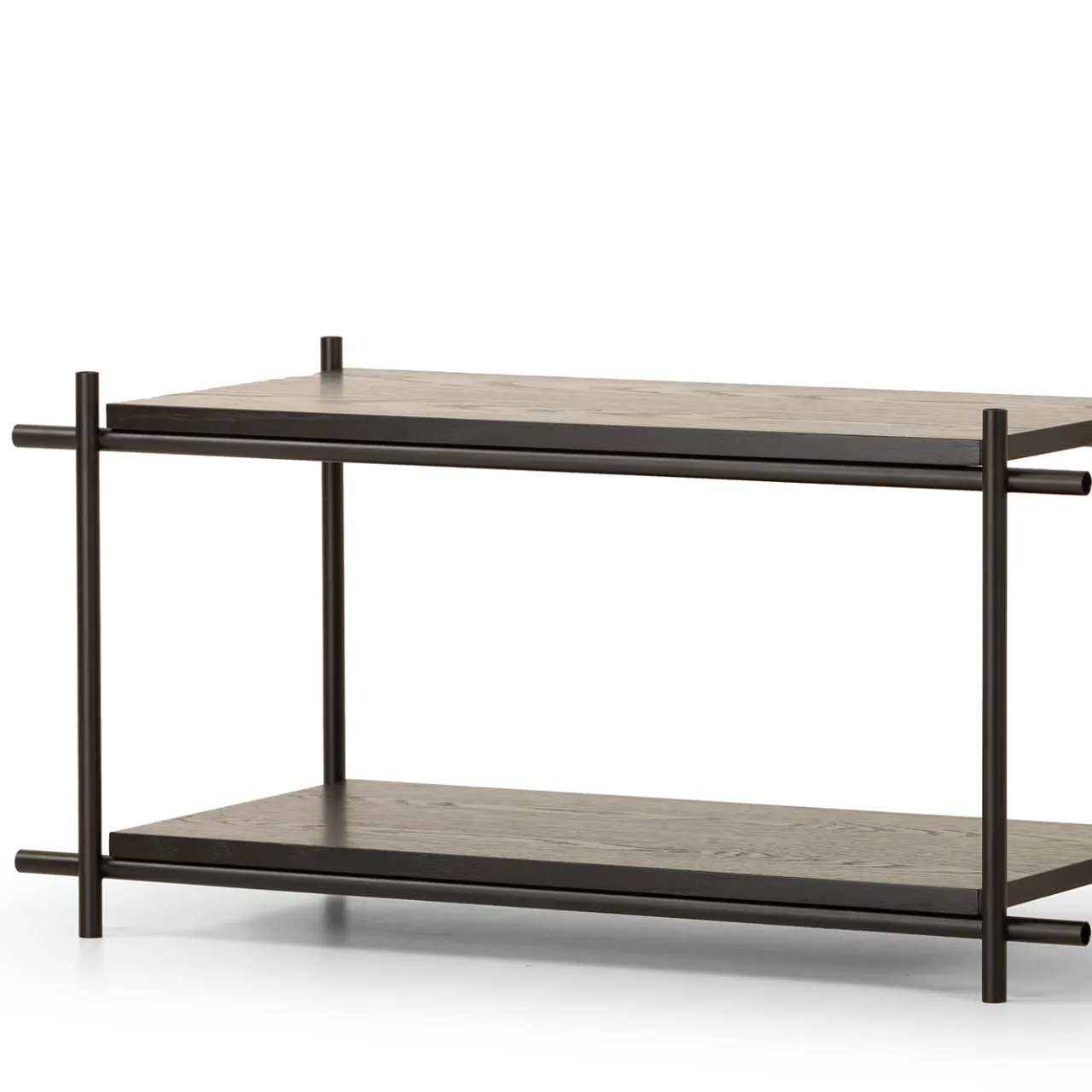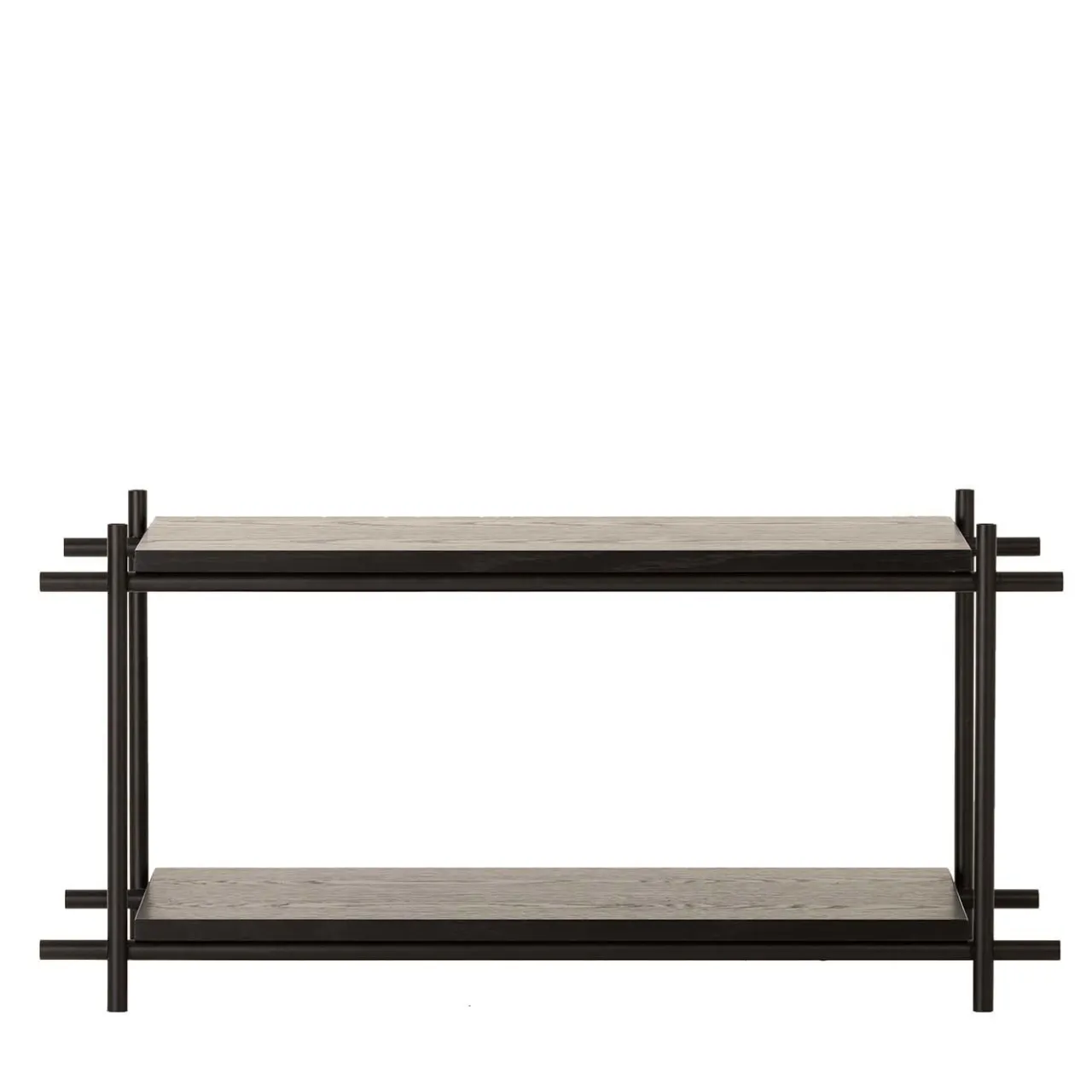 Elegante e funzionale, questa libreria monoblocco del sistema modulare Innocent combina linee pure e texture per dare forma a questo elegante design di Gio Tirotto. La struttura aperta è composta da due ripiani in legno di rovere verniciato nero collegati da tubi di ferro neri. Infinite combinazioni possono essere create impilando le unità per formare elementi d’arredo per una casa e un ufficio moderni e d’ispirazione industriale, da tavolini a consolle a librerie di diverse altezze.