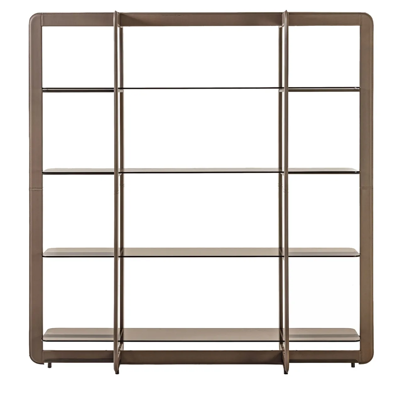 Libreria con struttura in metallo tubolare a sezione rettangolare e rivestimento in pelle. Ripiani in cristallo e dettagli in ottone o laccati. Tutti i componenti sono disponibili in altri colori. Per maggiori informazioni, contattare il concierge.