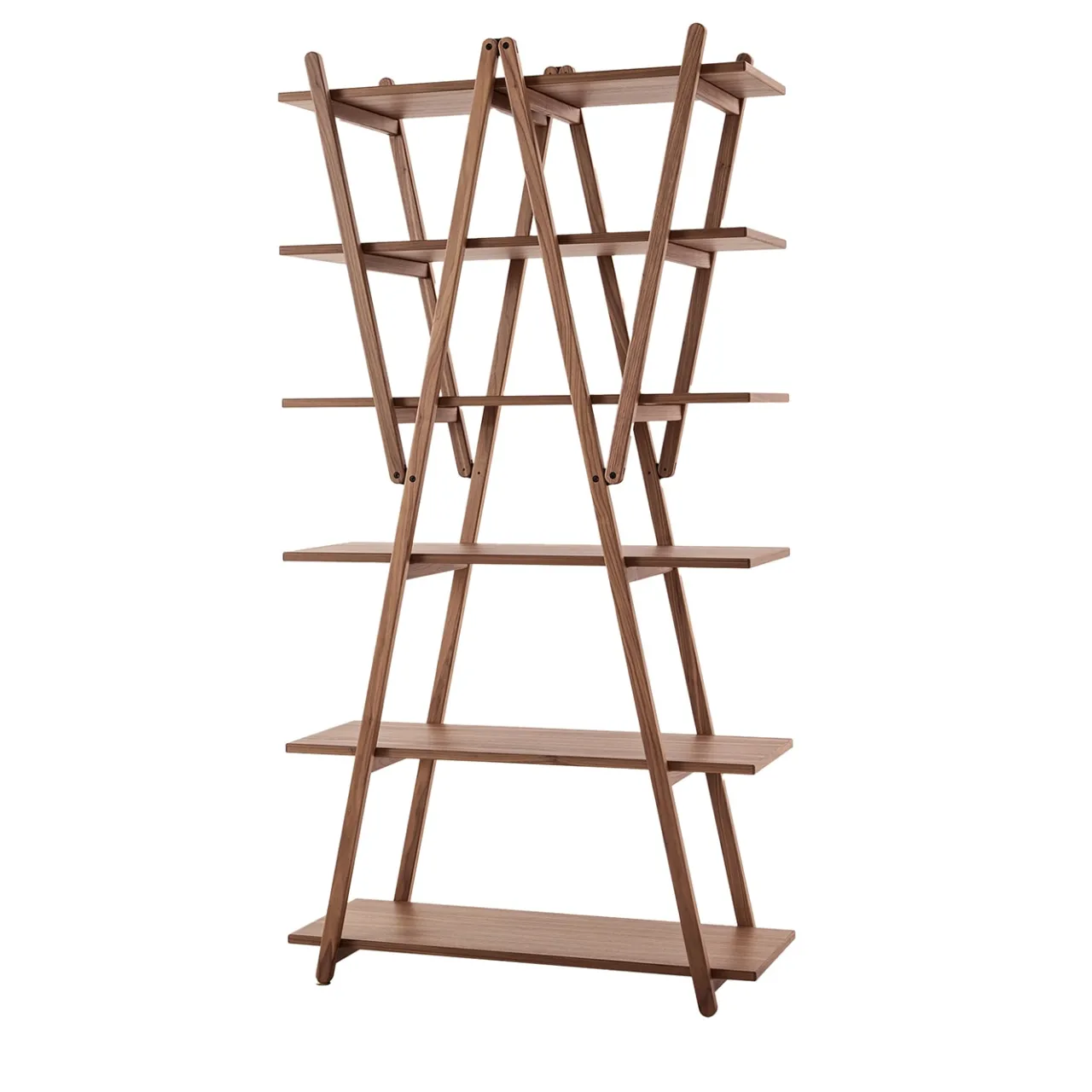 Disegnata da Vico Magistretti, questa libreria dalle linee semplici e pulite nasce da un’analisi dettagliata del modello classico con supporti laterali e ripiani. I puntoni diagonali diventano la struttura portante e ospitano i ripiani, eliminando la necessità di supporti laterali. Ponendo l’accento sulle cerniere e sui sei ripiani, la struttura, che può essere ripiegata, può essere utilizzata anche come divisorio.