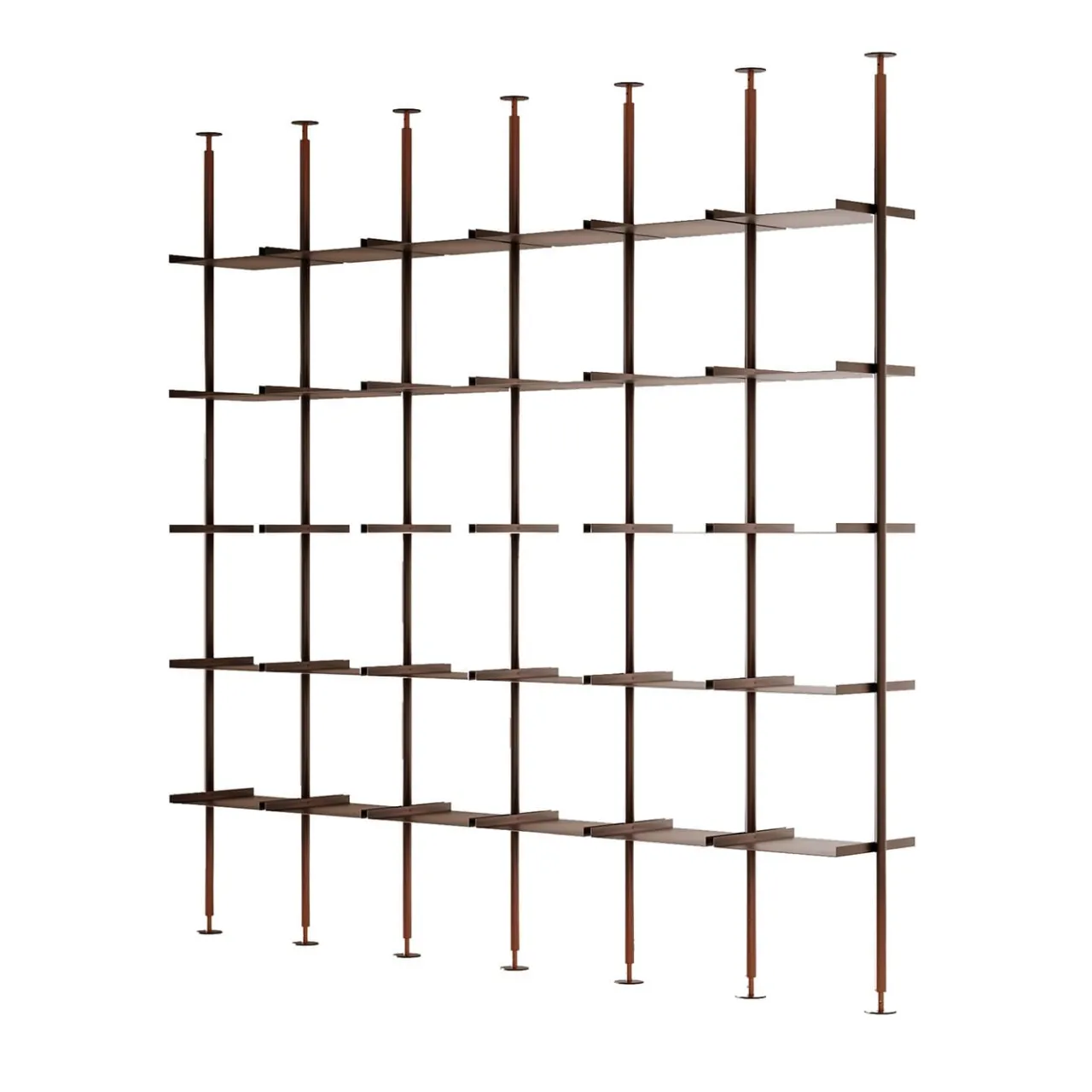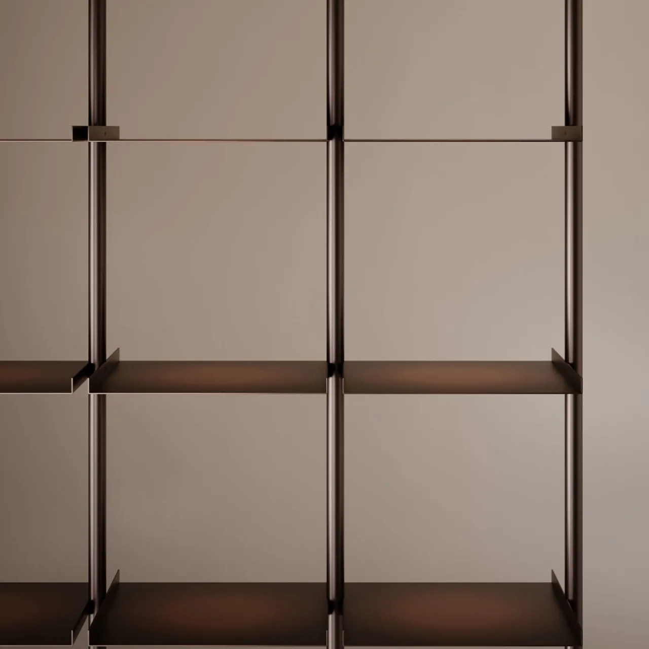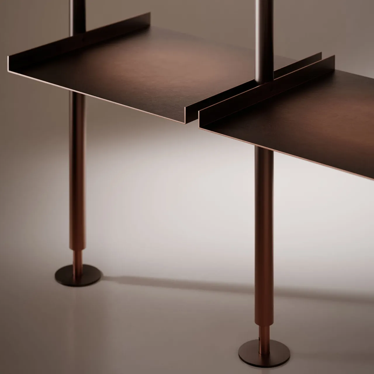 La libreria Open è un sistema caratterizzato da precisione formale, creato per dividere e organizzare gli spazi. Il suo design geometrico mette in risalto le linee pulite della struttura in rame brunito miscelato, composta da aste verticali e ripiani regolabili in altezza, ammorbiditi da una meticolosa finitura a mano. Questo sistema amplia le possibilità di composizione, consentendo varie configurazioni modulari.