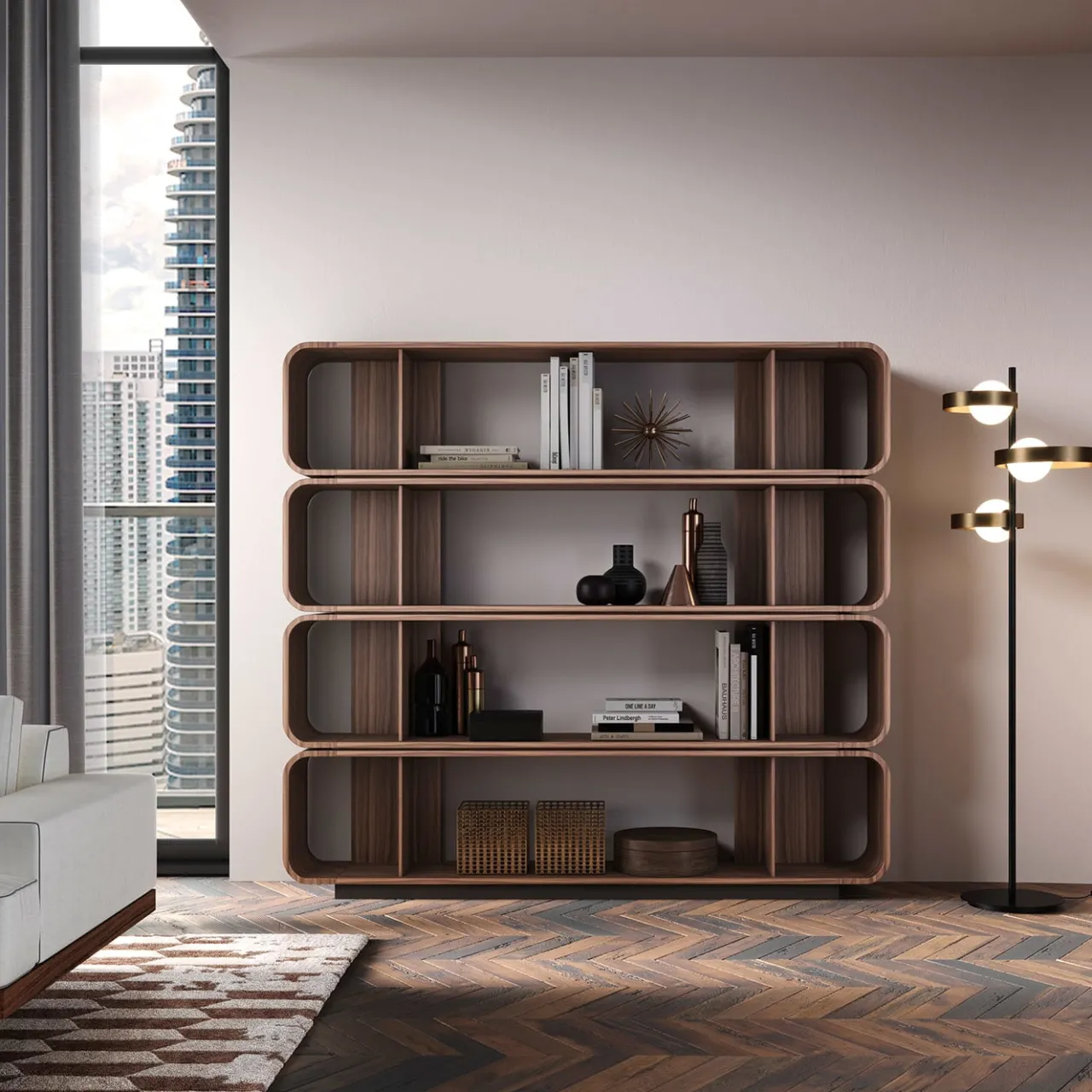 Questa raffinata libreria dal design elegante e contemporaneo, firmata da Manuela Pelizzon, conferisce a una zona giorno uno stile senza precedenti. Caratterizzata da linee arrotondate ed eleganti, è realizzata a mano in noce canaletto con quattro ripiani orizzontali che si uniscono a formare una silhouette di grande effetto. Questo progetto può essere personalizzato nelle dimensioni; per ulteriori informazioni, consultare il Concierge.