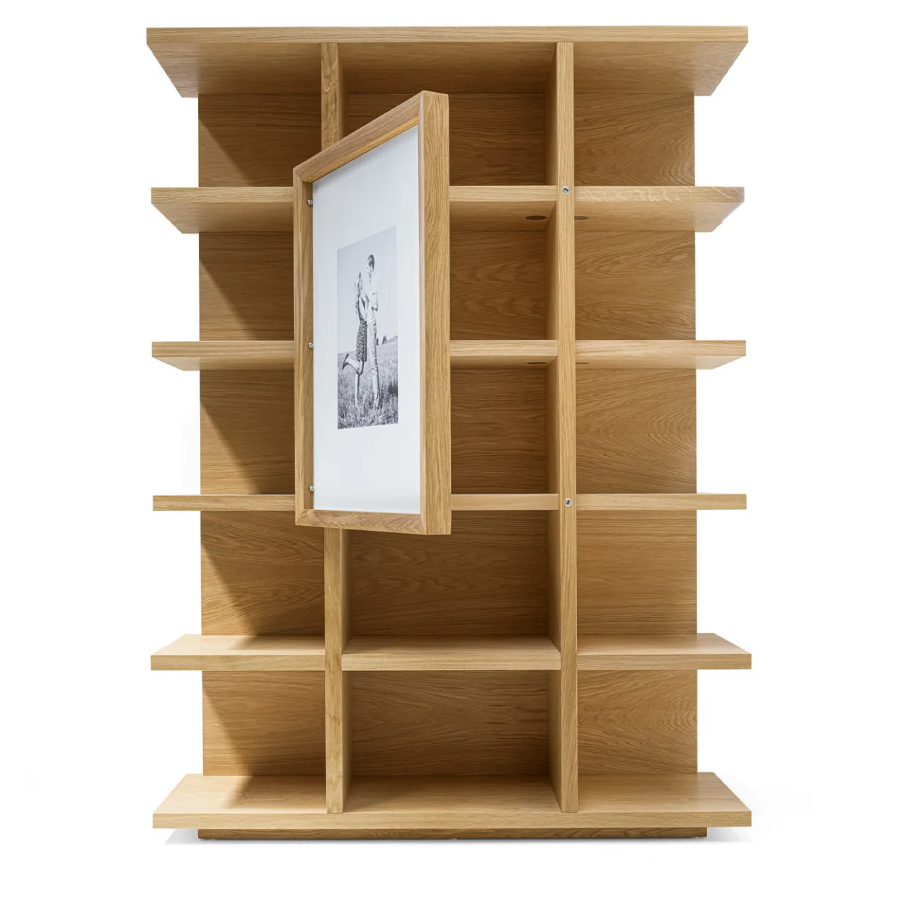 La libreria Sakari, disegnata da Terry Dwan, è caratterizzata da un’anta a cornice distintiva, con bordo in legno massello e pannello decorato con immagini fotografiche. Realizzata in rovere senza nodi con finitura a cera, offre numerosi ripiani a giorno per soluzioni di contenimento e esposizione versatili. Il pannello centrale, unico nel suo genere, rende questo elemento un’aggiunta funzionale ma anche artistica agli interni contemporanei.