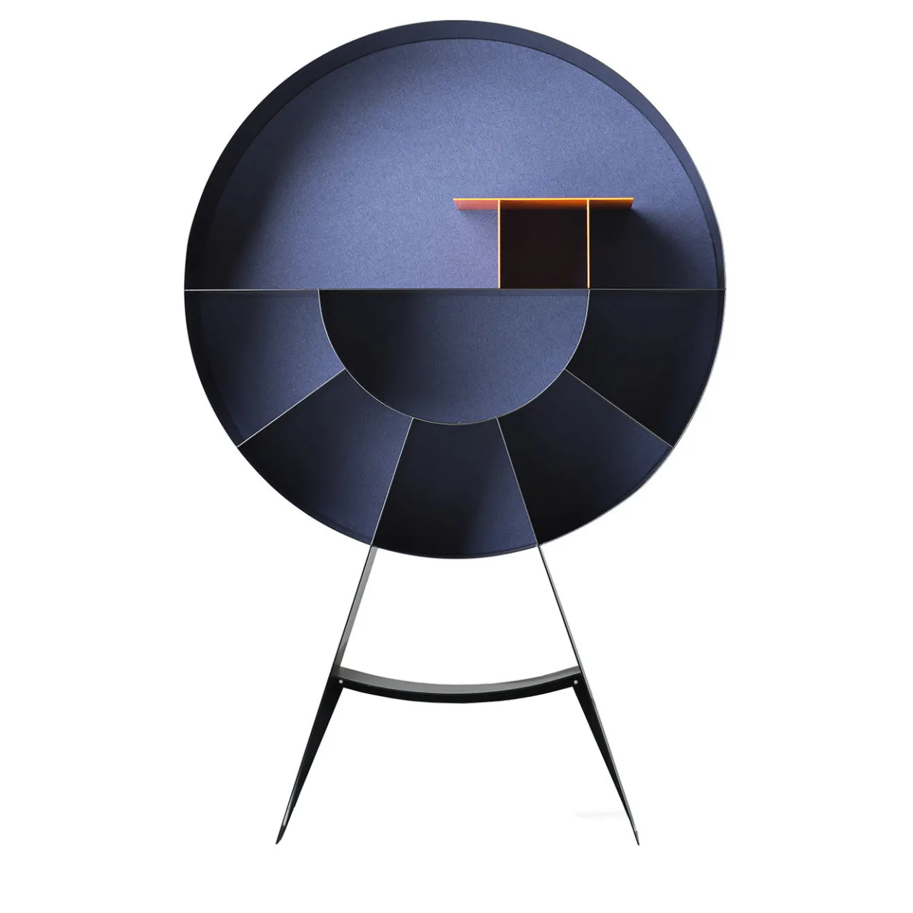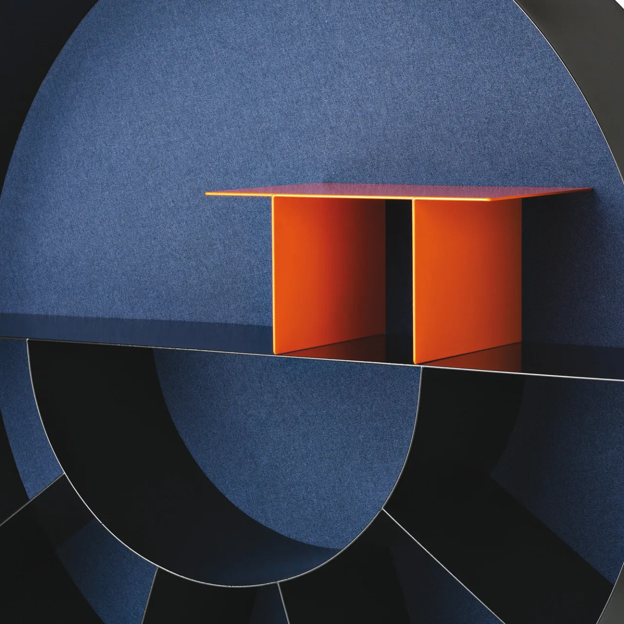 Questa scultura unica in acciaio, che funge anche da libreria, è caratterizzata da forme sorprendenti che valorizzano qualsiasi spazio in cui viene collocata. La base triangolare dritta in acciaio è ammorbidita dalle curve dell’elemento circolare in cima, creando un look dinamico. L’interno dell’elemento superiore è completato da una serie di ripiani che si stagliano sul blu brillante dello schienale del pezzo e che bilanciano perfettamente il colore scuro dell’acciaio. Un ripiano centrale rosso aggiunge un tocco di colore. Questo pezzo si adatta perfettamente a qualsiasi ambiente della casa.