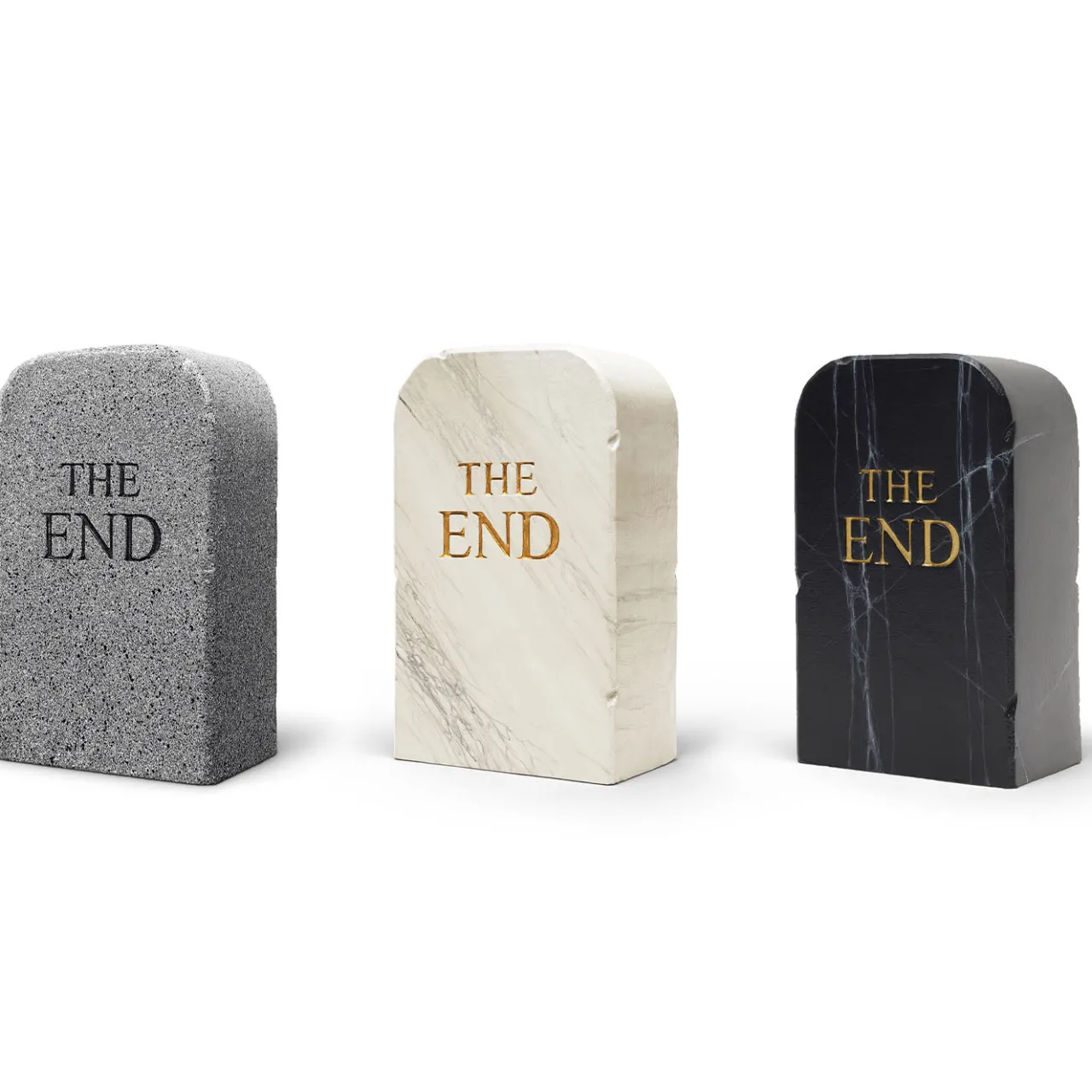 Seduta in poliuretano morbido rifinita e decorata con Guflac®. The End è un epitaffio ironico creato da Maurizio Cattelan e Pierpaolo Ferrari per dichiarare la “fine” del marchio Gufram e per suggerire un nuovo inizio. The End nasce, proprio come una lapide, da un processo di scultura e sgrossatura dei singoli elementi in poliuretano espanso da parte di esperti artigiani. La finitura in “finto marmo” è realizzata con Guflac®.