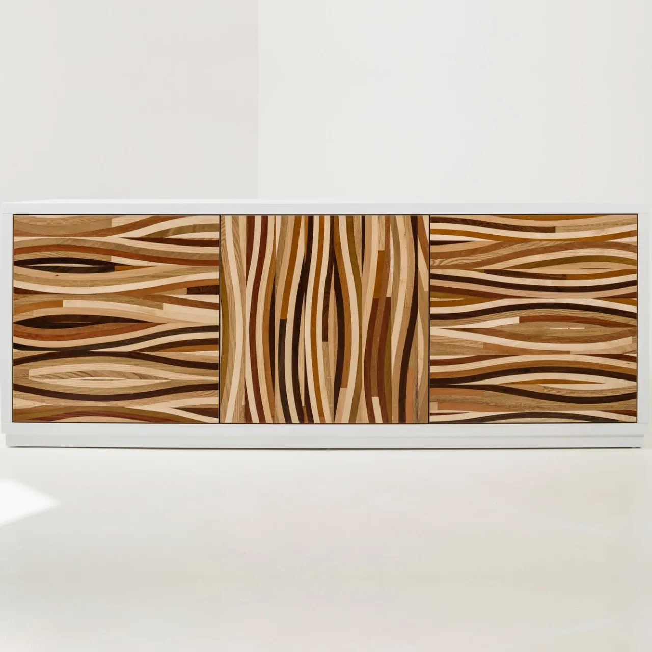 Questo versatile oggetto d’arredo funzionale è realizzato in legno e combina una semplice struttura rifinita con una laccatura bianca lucida all’interno e all’esterno e tre pannelli frontali di grande effetto. Ogni pannello è decorato a mano con un metodo esclusivo sviluppato da Ferrantelli Falegnameria, che prevede l’intreccio a mano di legno di recupero di diversi tipi e colori per creare un motivo accattivante e allo stesso tempo organico. Le dimensioni possono essere personalizzate contattando il Concierge.