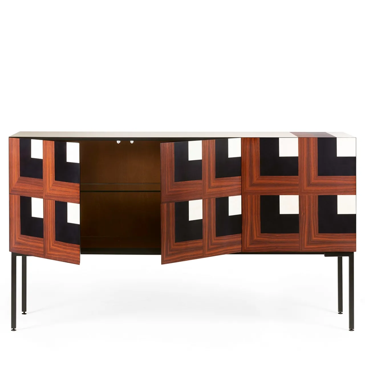 Esperti maestri del legno hanno realizzato questo pezzo che presenta una squisita decorazione in legno che ricrea un’illusione ottica tridimensionale. I legni utilizzati sono l’ebano, il bois viola e il frassino sbiancato, mentre l’interno del pezzo è in prezioso palissandro Santos. Le gambe allungate in ferro spazzolato con finitura nera opaca completano questo oggetto di grande effetto che conferisce un fascino senza tempo a qualsiasi spazio.