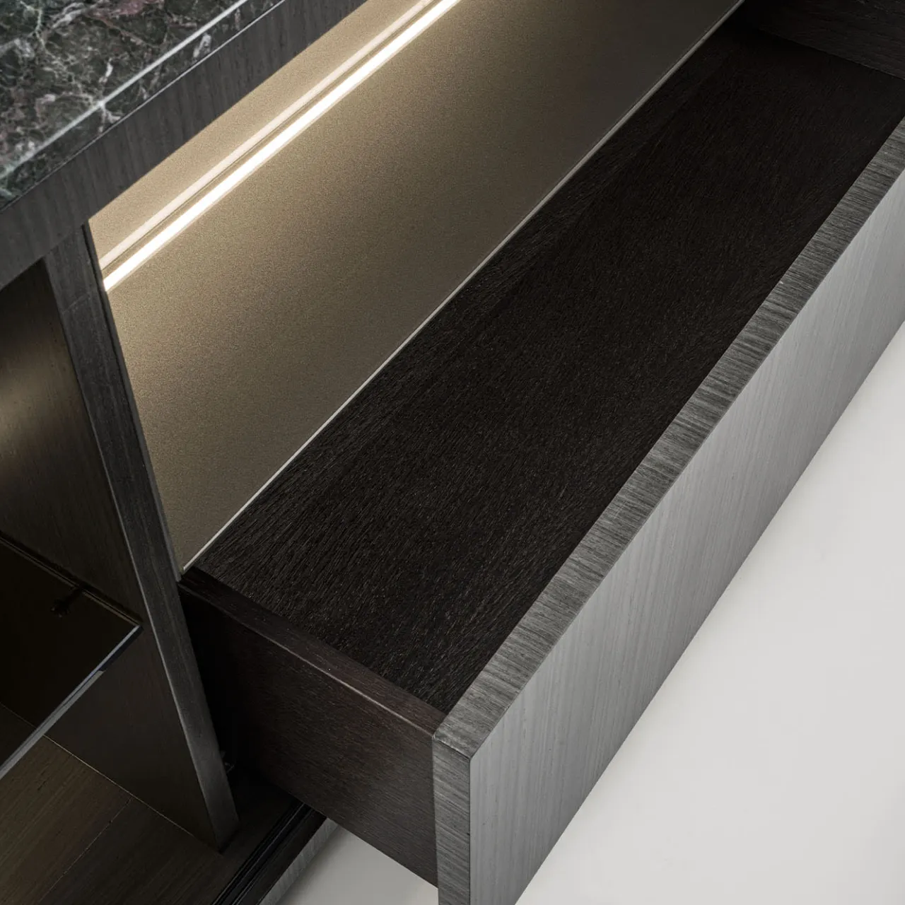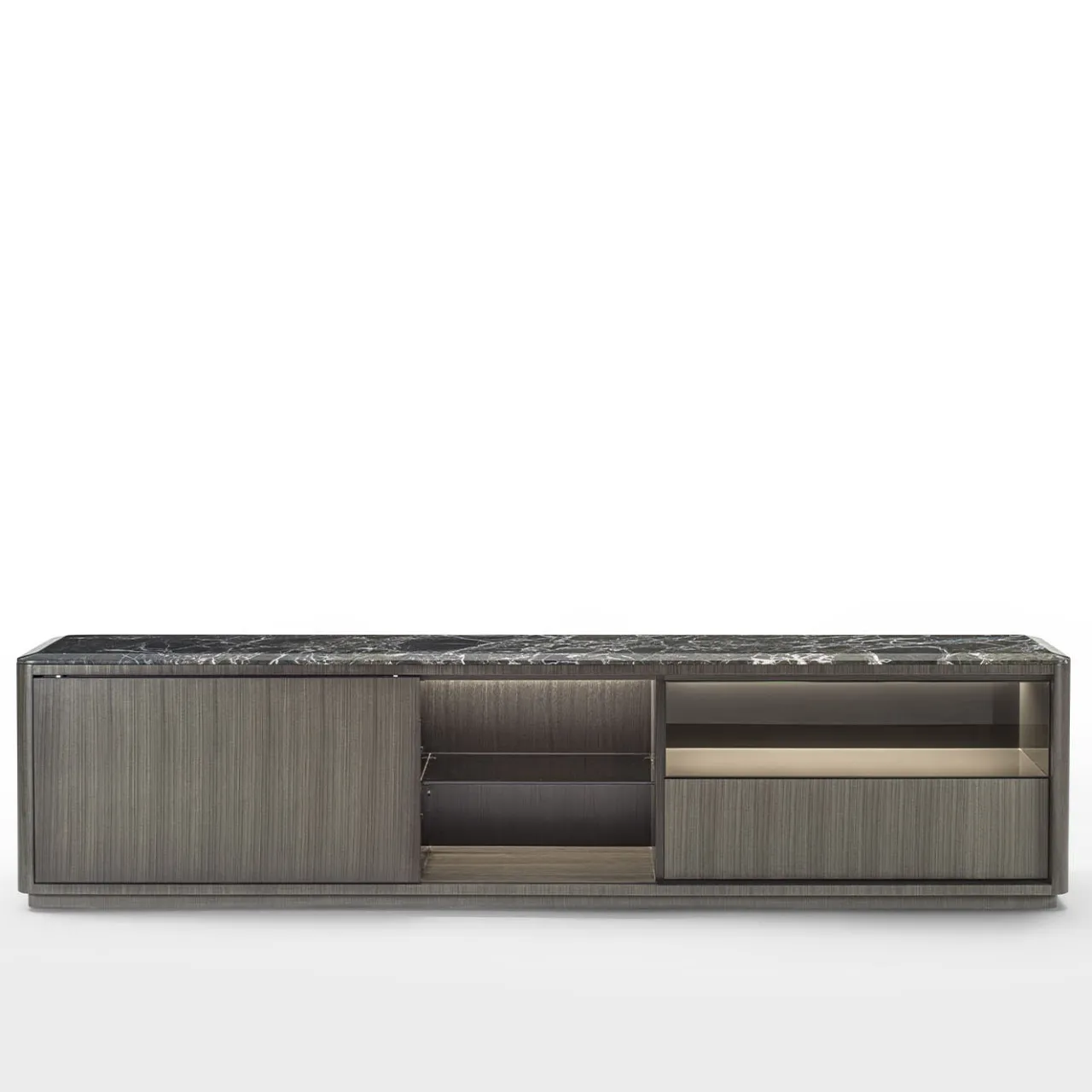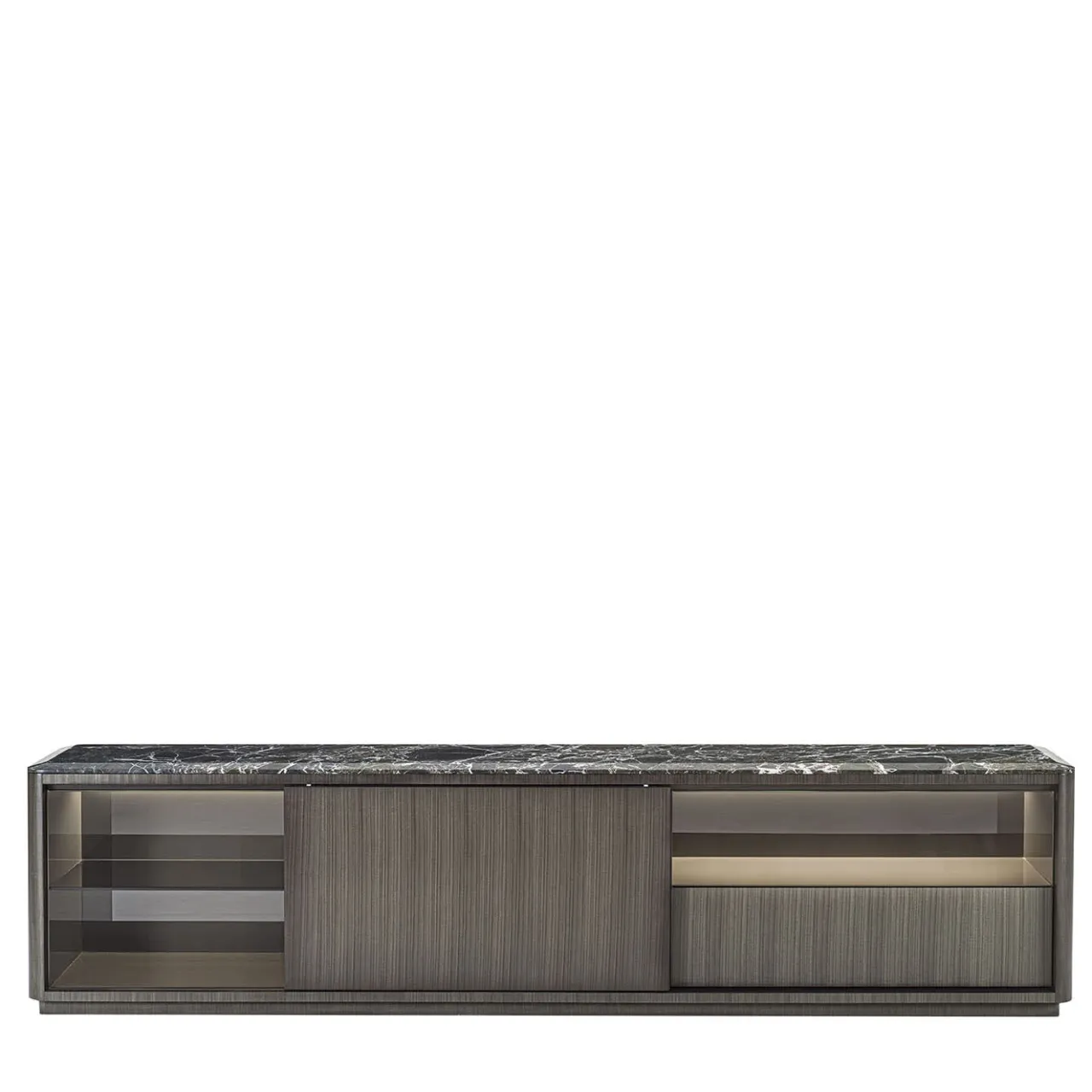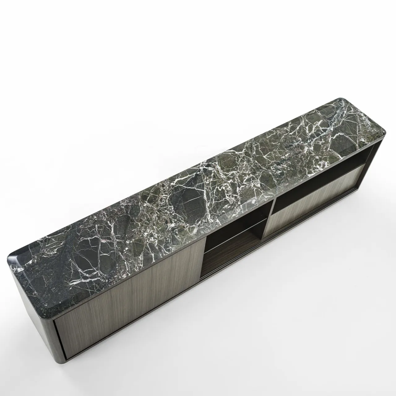Credenza caratterizzata da un design lineare, impreziosito dalla struttura rivestita in Tay scuro e dal dettaglio degli angoli arrotondati. L’anta scorrevole crea composizioni multiple con vani a giorno e cassetti. La struttura interna dei vani a giorno è in vetro verniciato con finitura Oro-Bronzo. Il piano in marmo verde Lepanto è impreziosito da una smussatura lungo tutto il perimetro. Su richiesta, questo pezzo è disponibile anche con un sistema di illuminazione interna.