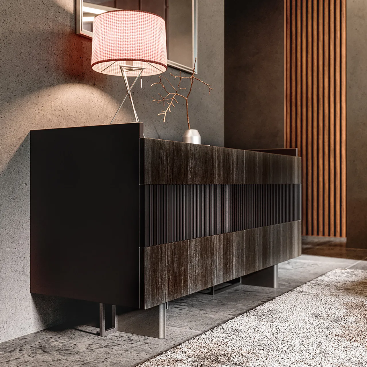 Questa credenza combina materiali pregiati e dettagli sofisticati in una struttura in legno laccato con piano rivestito in pelle. Il fronte è composto da quattro cassetti in impiallacciatura di legno con apertura push-pull e due cassetti in legno laccato arricchiti da un elegante motivo rigato. La base poggia su due pannelli rivestiti in pelle, completati da telai in metallo. Disponibile in una vasta gamma di finiture personalizzabili in pelle, tessuto, legno e metallo, per un design su misura. Per ulteriori informazioni si prega di contattare il Concierge.