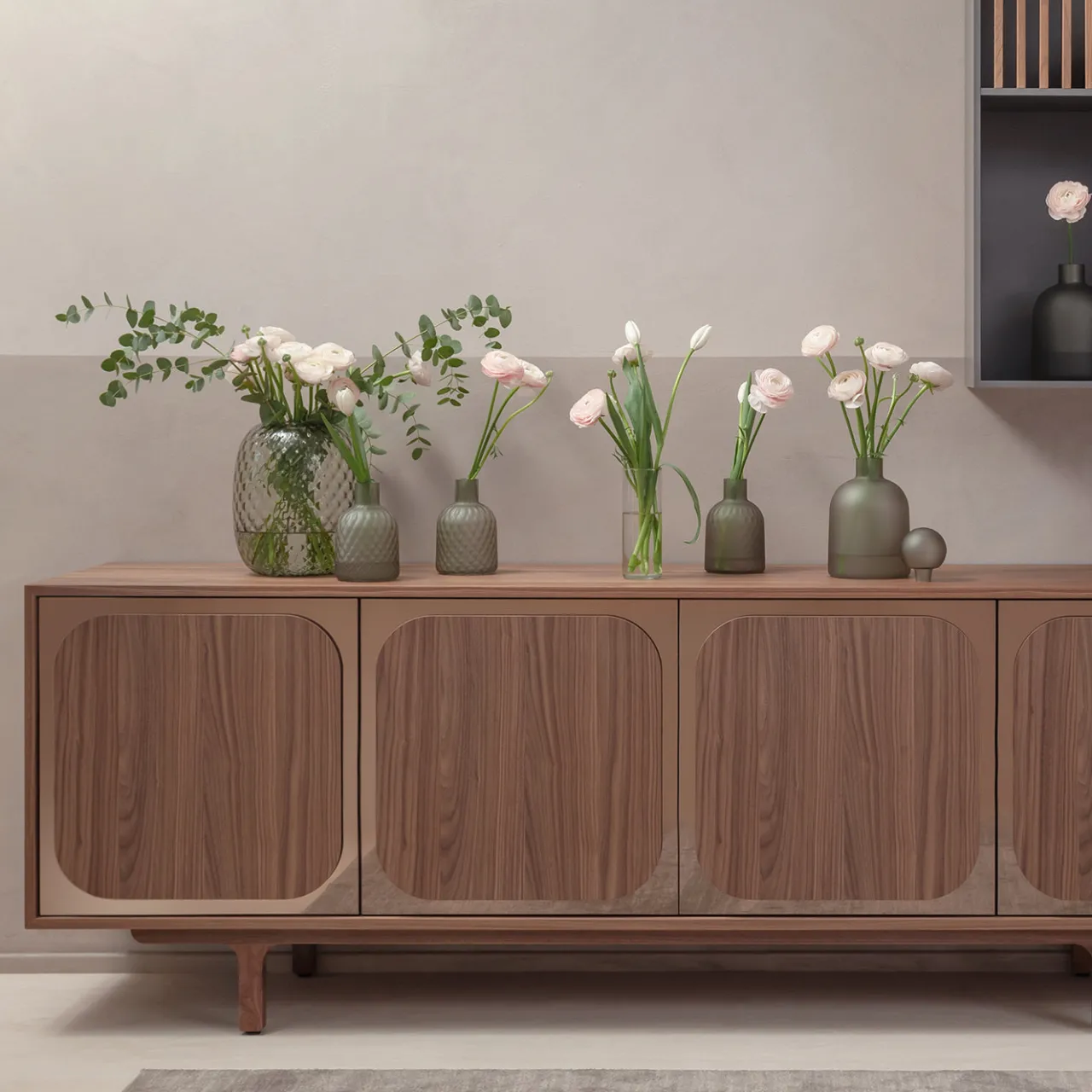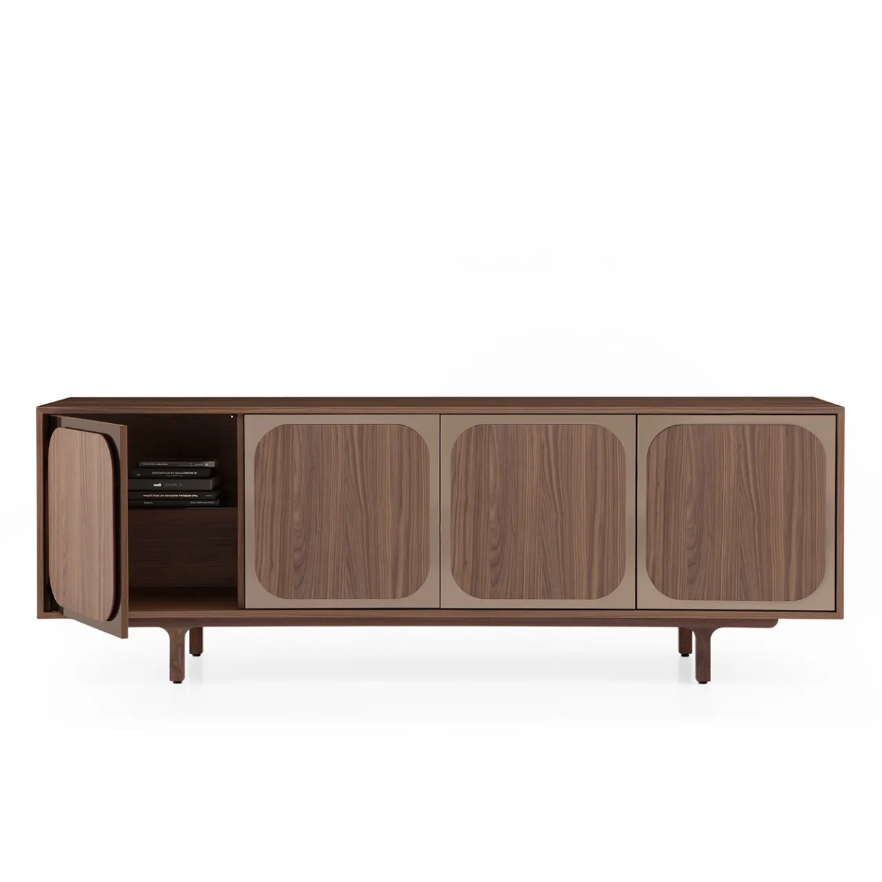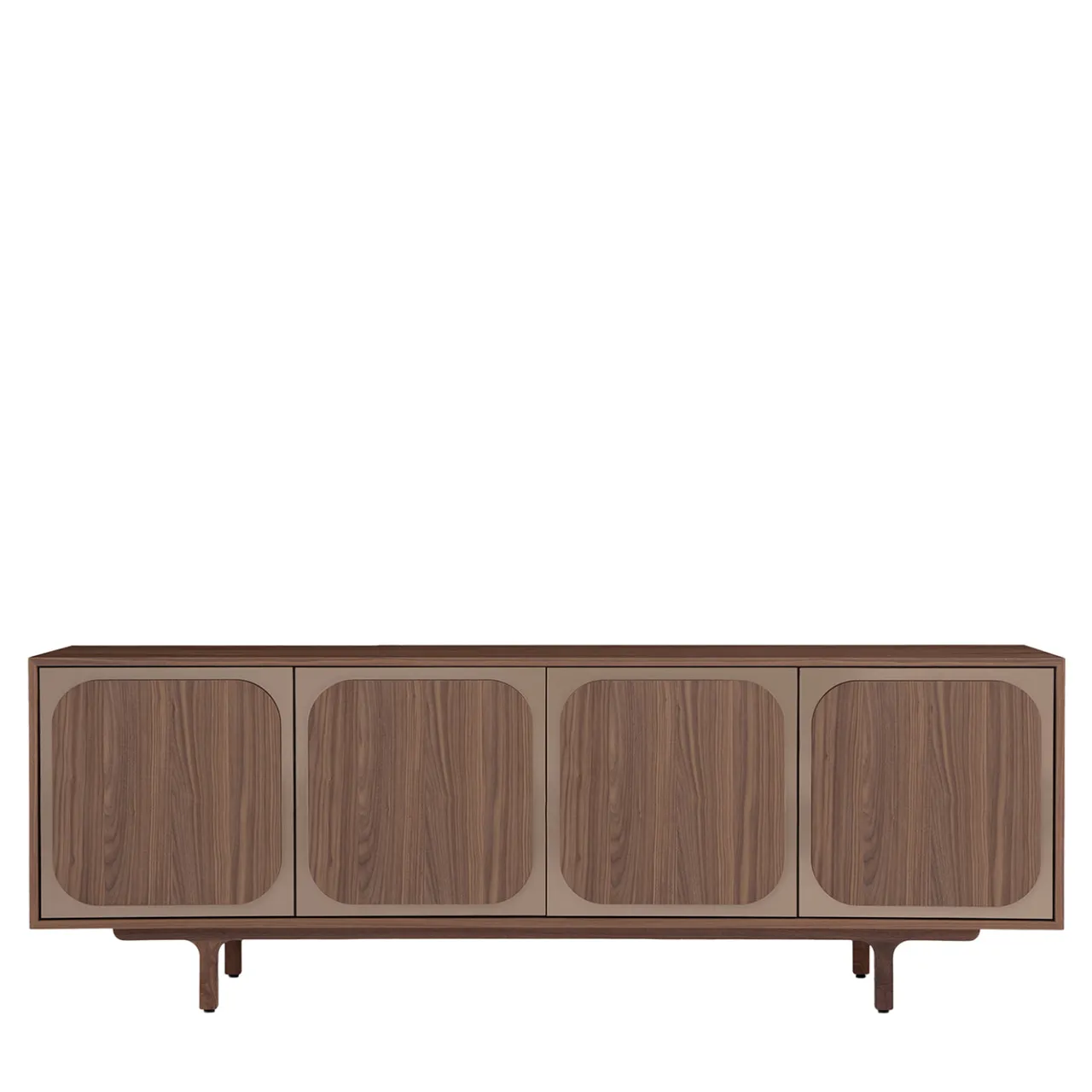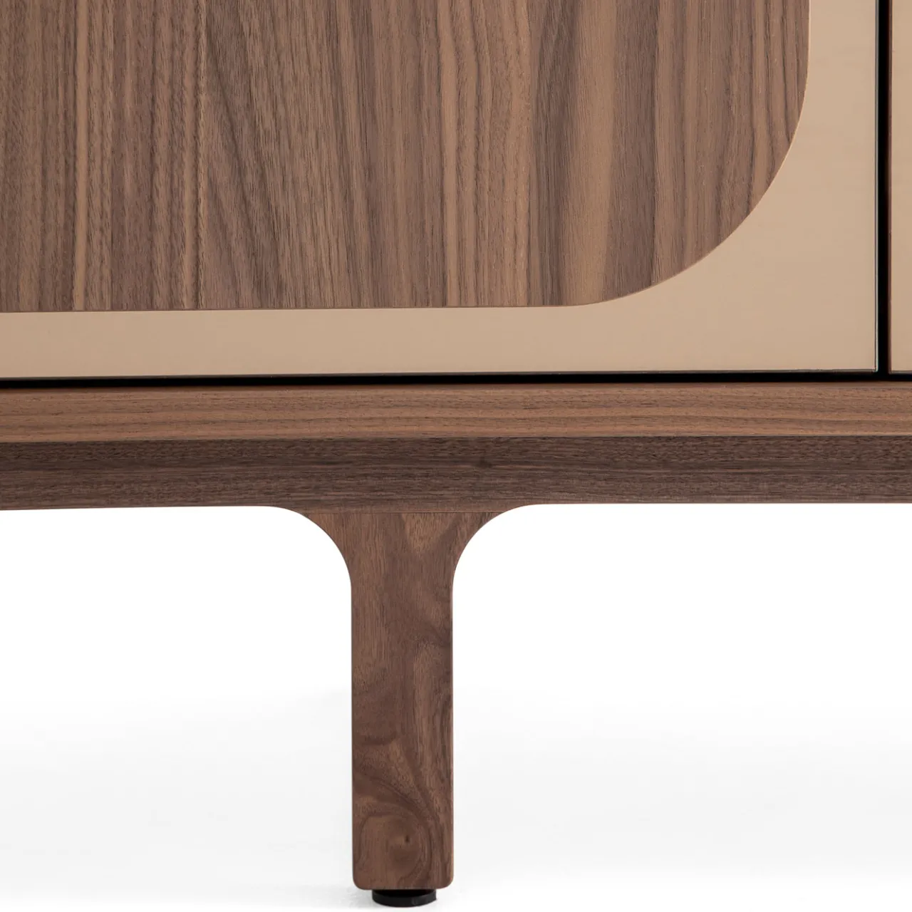 La madia Margarette presenta una struttura di dimensioni medie con 4 ante realizzate in metacrilato specchiato bronzato combinato con legno di noce canaletto incassato. Include una base in noce massello, due cassetti finiti in impiallacciatura di noce canaletto e due ripiani in vetro fumé trasparente all’interno. Dotato di meccanismi di chiusura push-pull, questo pezzo offre un design durevole e attento all’ambiente con un’estetica contemporanea.