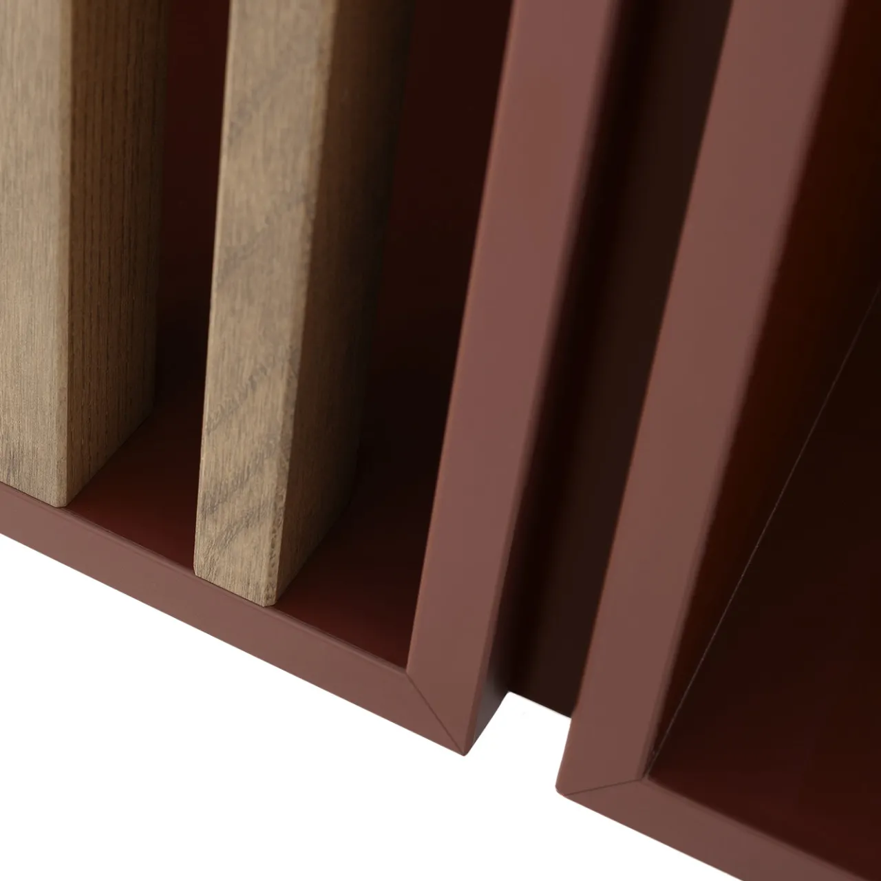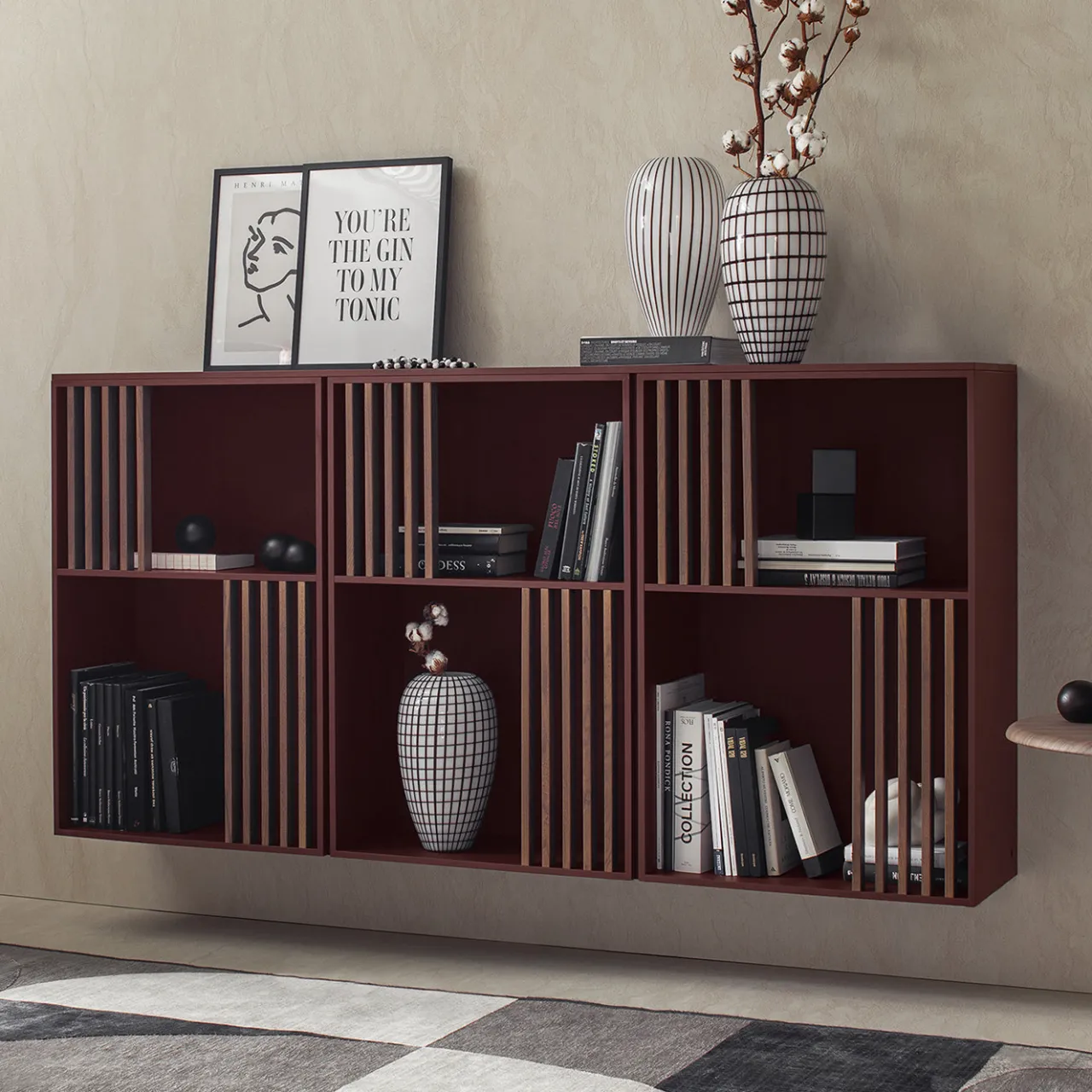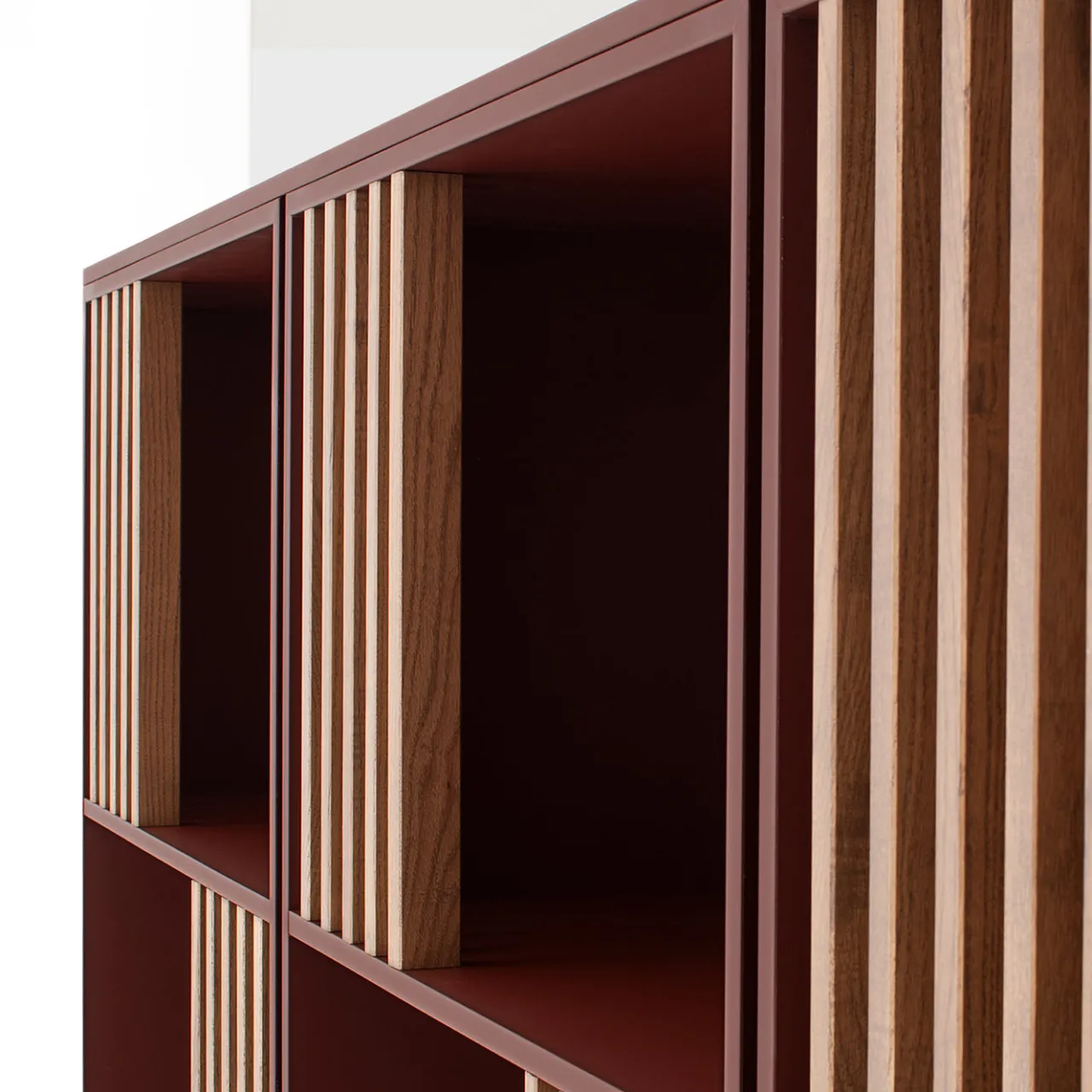 La madia a giorno Mondrian presenta una composizione sospesa di scomparti aperti realizzati in MDF impiallacciato PET amaranto opaco, arricchita da listelli verticali in legno massello di frassino tinti noce. Questo mobile di design combina colori audaci e accenti in legno naturale adattandosi a interni contemporanei e offrendo ampio spazio per l’esposizione e l’organizzazione.