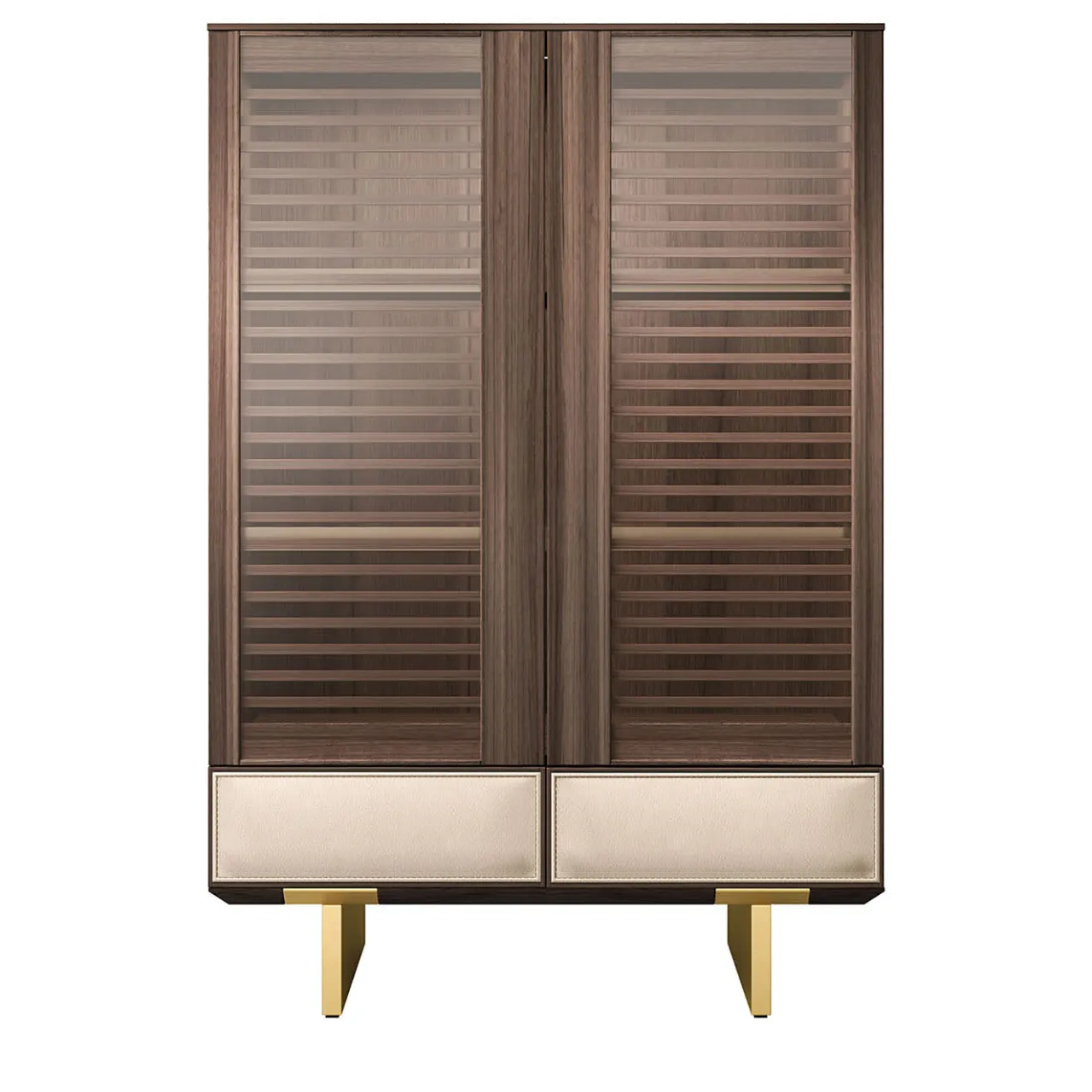 La Madia Solferino è un’opera d’arte funzionale. Il noce canaletto brunito incornicia i cassetti in pelle beige, creando un contrasto tattile. Le ante in vetro a doghe svelano il contenuto interno con delicatezza. La base, con dettagli dorati, aggiunge luce e lusso. Un mobile che invita al tatto e all’ammirazione, perfetto per chi ama materiali pregiati e design sofisticato.