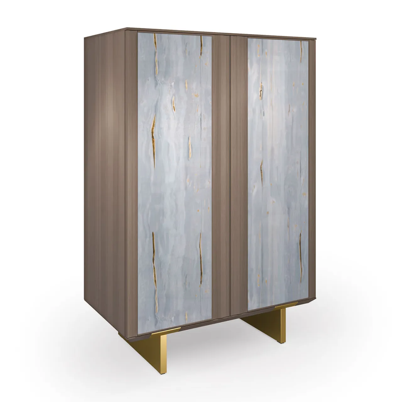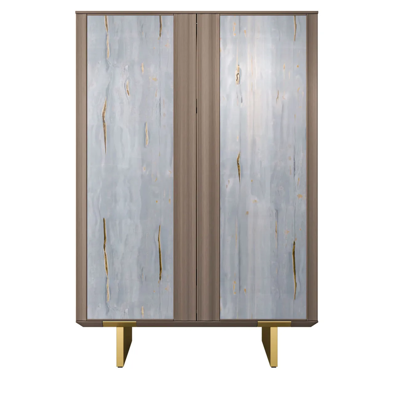 La Madia Solferino incarna l’eleganza contemporanea. Il vetro artistico grigio con striature dorate cattura la luce, crean-do profondità. La struttura in noce cana-letto naturale esalta la bellezza del vetro. Le ante push-to-open rivelano interni cu-rati, con ripiani in alluminio e vetro. Ideale per chi cerca un mobile elegante e funzionale, un elemento distintivo per in-terni moderni.