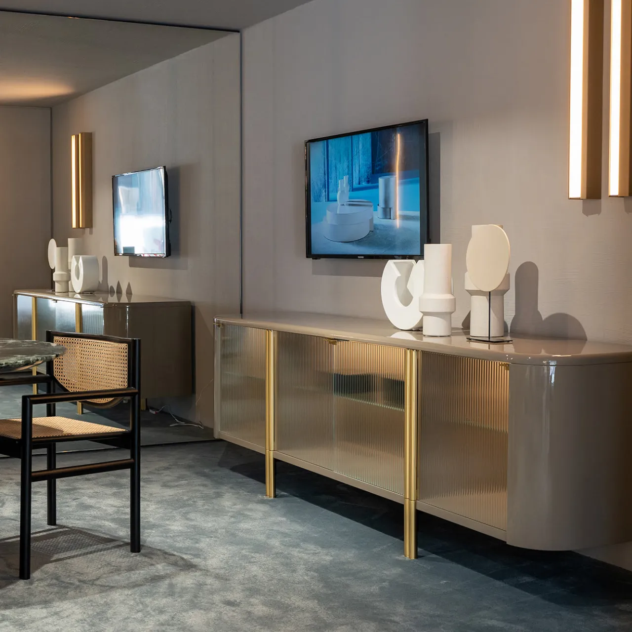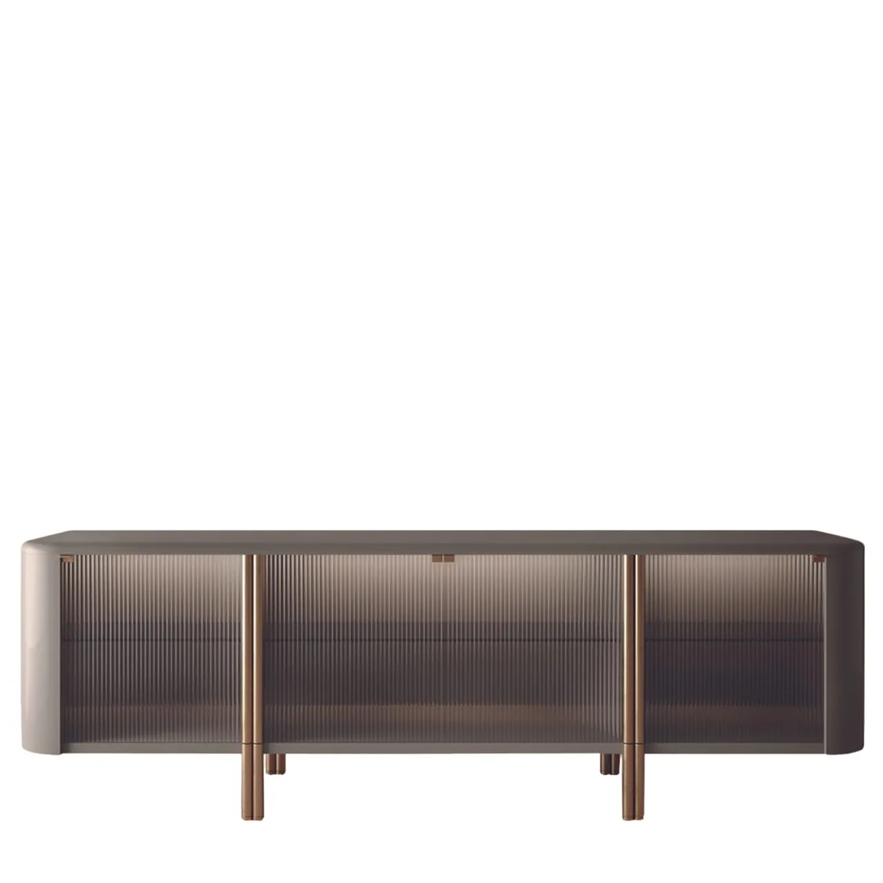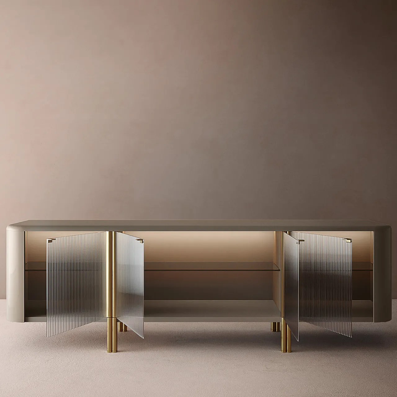 L’elegante contenitore è caratterizzato da ante in vetro temperato cannettato e da una struttura metallica color ottone opaco con cerniere a perno per un tocco raffinato. L’interno vanta ripiani in vetro temperato extrachiaro e una robusta struttura in MDF e multistrato di pioppo, rifinita con una laccatura lucida color argilla. L’illuminazione interna a LED non è inclusa, ma è disponibile su richiesta.