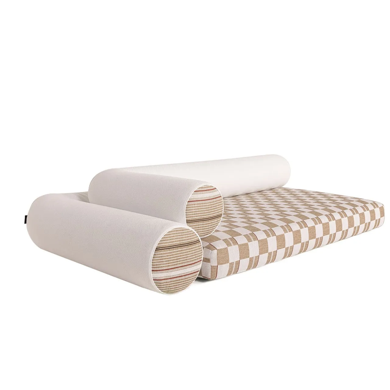 Majlis prende il nome da uno spazio tradizionale in uso nei Paesi arabi, dedicato all’ospitalità e alla convivialità. È un sistema di sedute modulari per esterni dalle dimensioni generose, dalle forme arrotondate e dall’eccezionale comfort di seduta. È caratterizzato da un ampio cuscino di seduta abbracciato da due rotoli che fungono da schienale, realizzati in diverse dimensioni e densità. Un tessuto traspirante e idrorepellente riveste l’inserto. Il prezzo comprende i cuscini decorativi, come mostrato nell’immagine, e la copertura protettiva per ogni modulo.