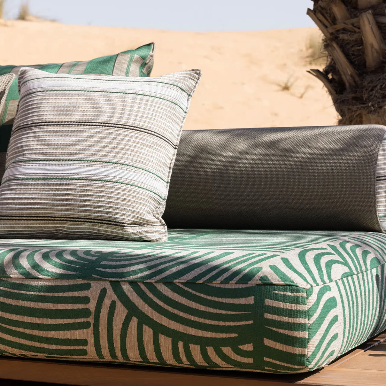 Majlis prende il nome da uno spazio tradizionale in uso nei paesi arabi, dedicato all’ospitalità e alla cordialità. È un sistema di sedute modulari dalle dimensioni generose, dalle forme arrotondate e dall’eccezionale comfort di seduta. È caratterizzato da un ampio cuscino di seduta abbracciato da due rulli di diverso diametro e densità che fungono da schienale. Un tessuto traspirante e idrorepellente riveste l’inserto. Il prezzo comprende i cuscini decorativi, come mostrato nell’immagine, e la copertura protettiva per ogni modulo.