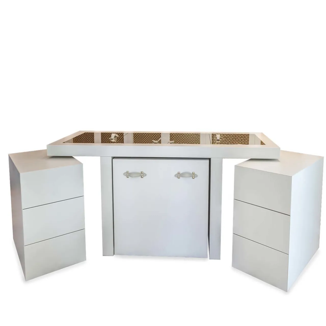 Questo singolare vanity desk è composto da tre pezzi: una scrivania centrale a forma di T e due eleganti unità laterali con cassetti montati su ruote che possono essere spostati vicino al pezzo centrale per ottenere un aspetto compatto. La scrivania, che fonde linee minimaliste con dettagli retrò, ha una struttura in legno con finitura bianca laccata opaca e una seduta estraibile con cuscino imbottito rivestito in elegante tessuto. Il piano presenta tre ante a ribalta con finitura oro 24k che nascondono una serie di scomparti in rovere e un grande specchio sul pannello centrale.