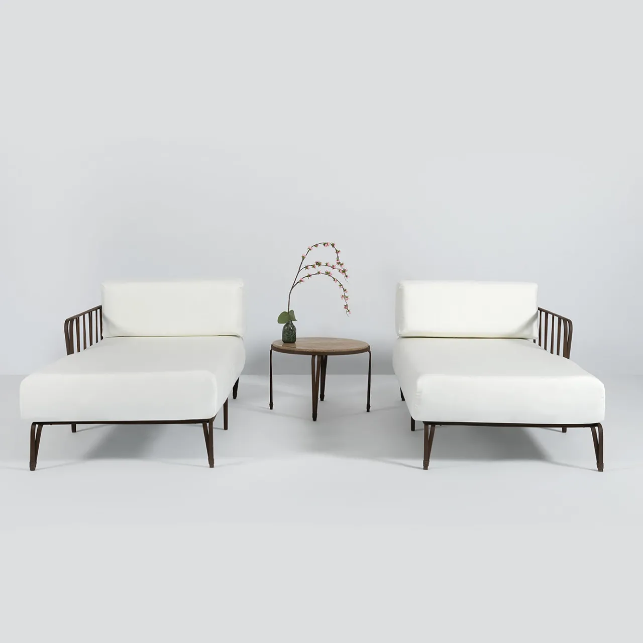 La Marina Chaise Longue fonde il vecchio con il nuovo, vantando una tradizionale struttura in ferro battuto marrone fiorentino con finitura zincata a polvere. Il suo fascino senza tempo è accentuato dall’elegante design bianco, rivestito in tessuto per esterni per una praticità ottimale. Il modo perfetto per trasformare qualsiasi spazio esterno in un’oasi di pace e tranquillità.