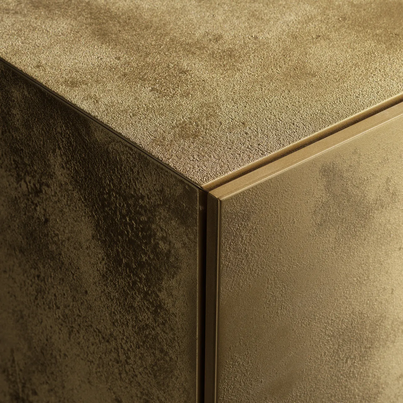 Madia dal design moderno e lineare, con tre ante e tre ripiani interni che offrono ampio spazio contenitivo. La struttura e i ripiani interni sono realizzati in pannelli a base di legno verniciati, mentre le ante sono rifinite in MDF verniciato. Disponibile in diverse finiture, la versione mostrata presenta un distintivo effetto “fonderia ottone” che dona alla madia una raffinata texture metallica. Ideale per ambienti living e dining contemporanei.