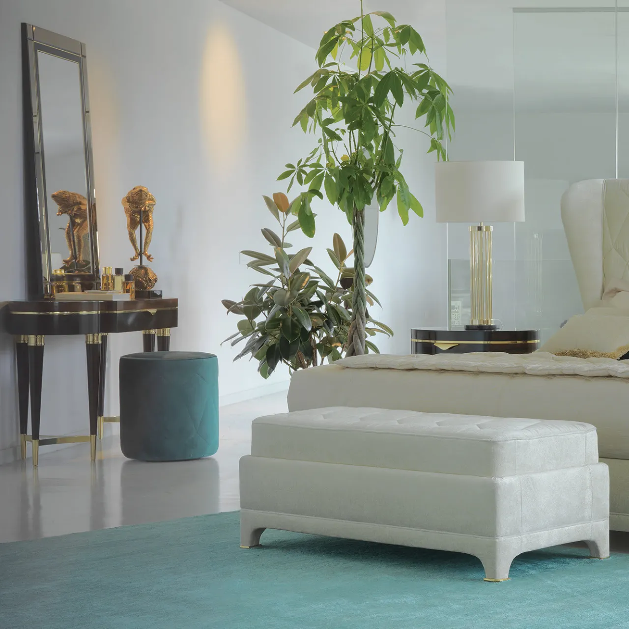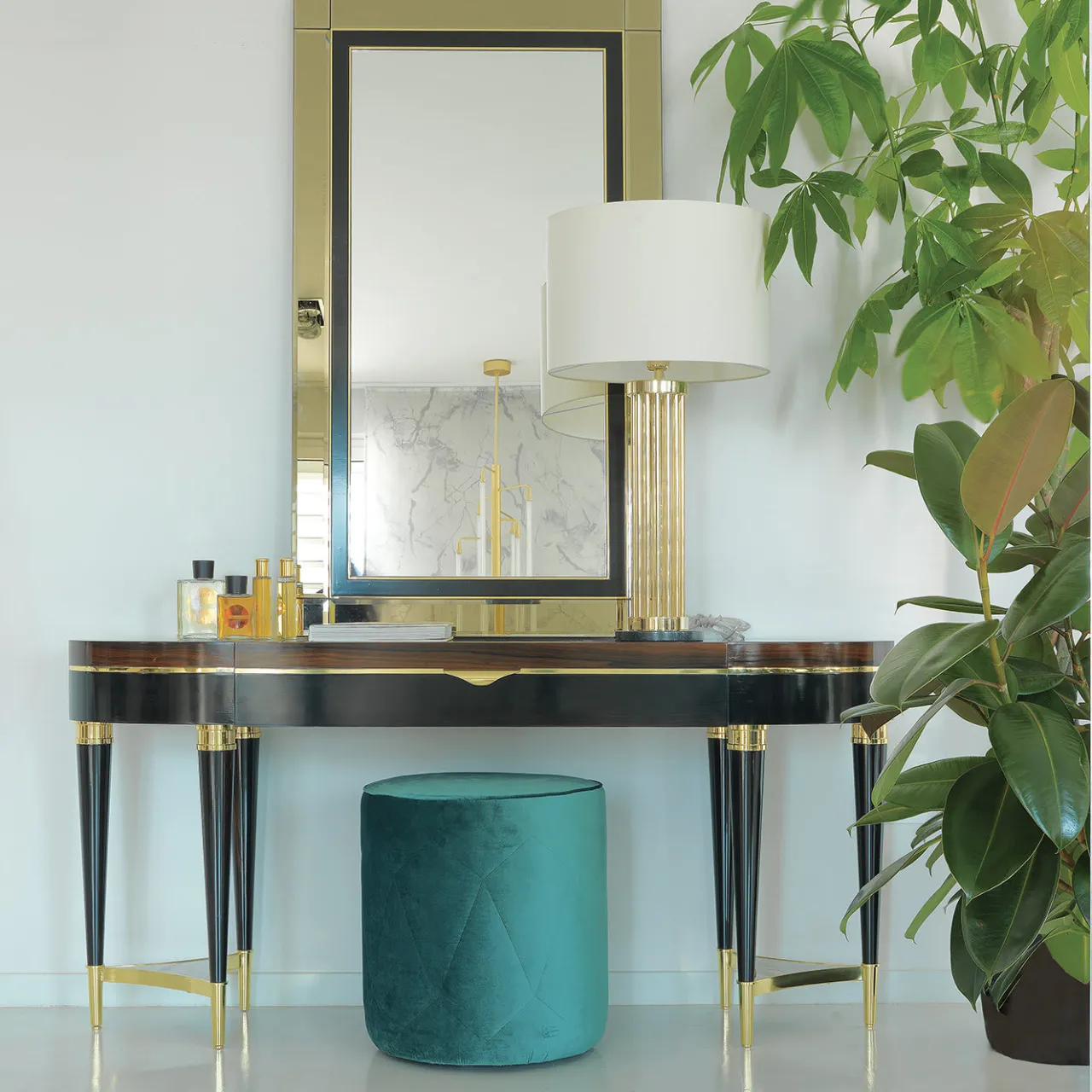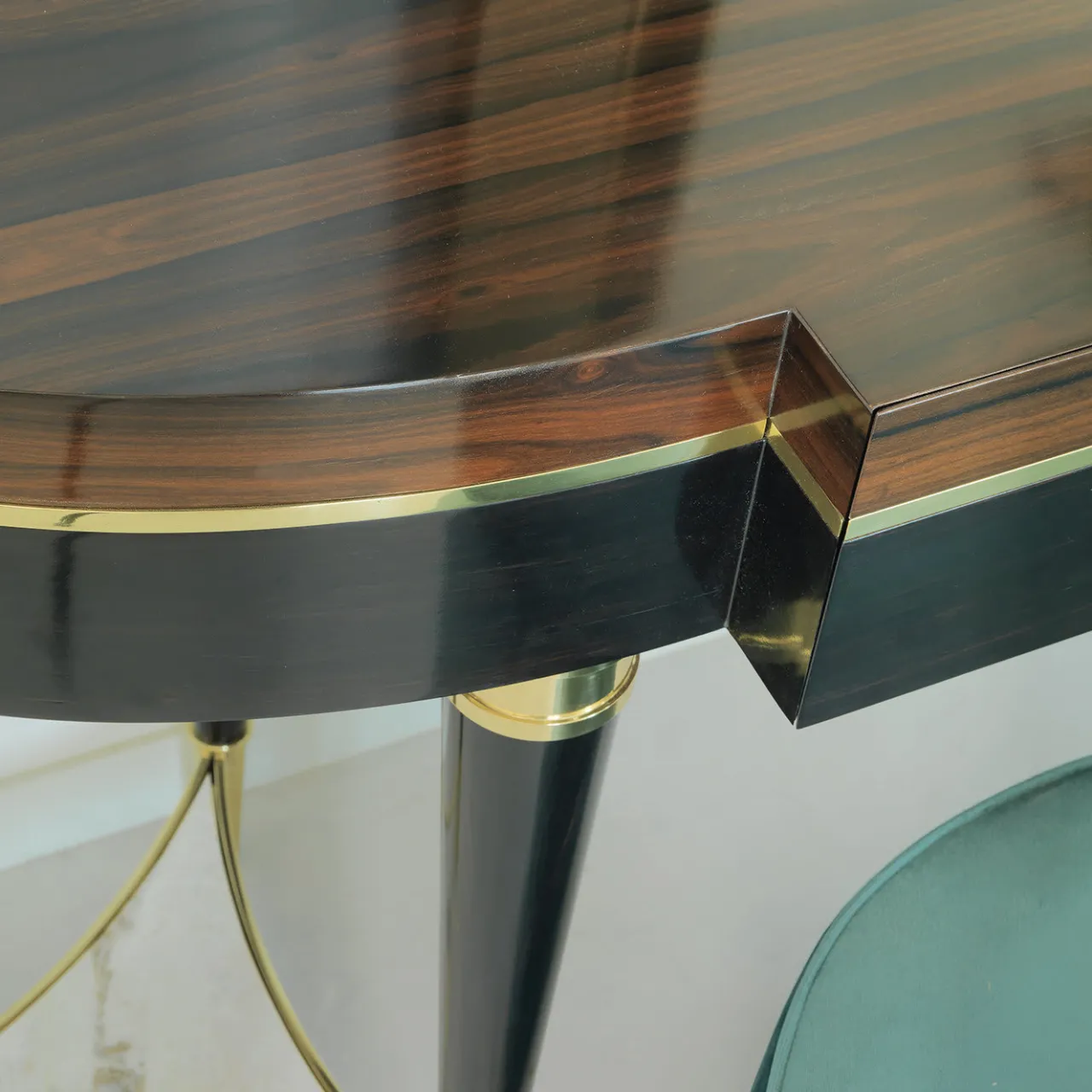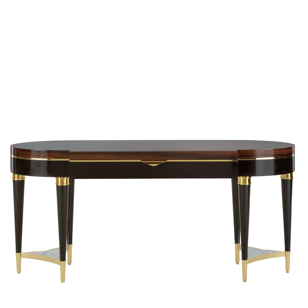 Parte di una collezione di mobili di pregio realizzati in ebano e dotati di un carattere audace e di una raffinatezza senza tempo, questa consolle è caratterizzata da sei gambe verniciate in ebano scuro, unite a tre a tre, e collegate da un inserto in marmo Corteccia fuso in ottone. Gli stessi materiali nobili si ritrovano nei dettagli della parte superiore e inferiore delle gambe e per separare la struttura in legno di ebano dal piano in ziricote, le cui venature grandi e dalla forma unica aggiungono un elemento decorativo unico al pezzo.