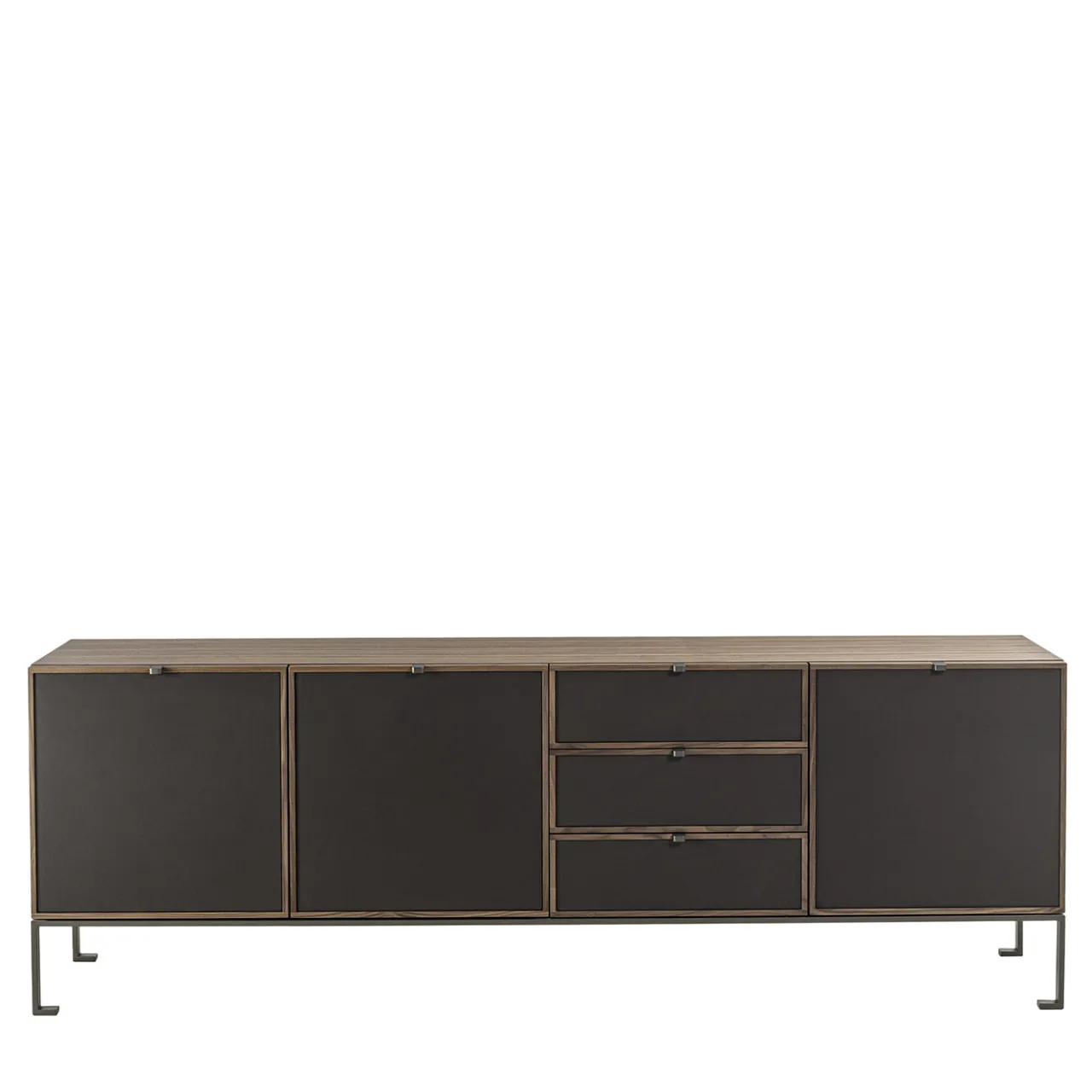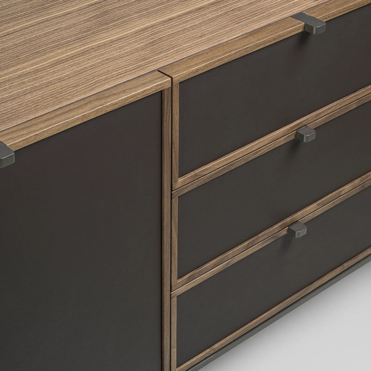 Il mobile contenitore Melody 4 presenta un design snello con una dimensione media adatta a spazi abitativi versatili. Offre tre porte e tre cassetti, ciascuno rivestito in pelle elegante, che complementa il piano in legno di noce e la base in metallo. Le opzioni includono porte e cassetti con finiture in legno rigato o rivestimenti alternati in legno e pelle, consentendo una personalizzazione su misura per adattarsi a vari stili d’interni. Contatta il Concierge per ulteriori informazioni.